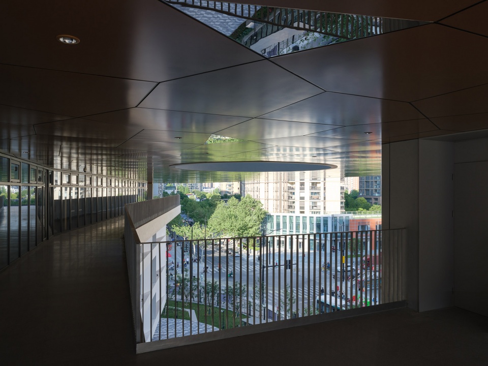 有别于传统封闭的“象牙塔”式校园,武宁中学的设计探索了教育空间与城市社会的开放性连接。通过开阔的走廊设计和局部镜面反射的巧妙运用,把街道景观动态地引入校园,让师生在行走间不经意地捕捉到城市的风景。