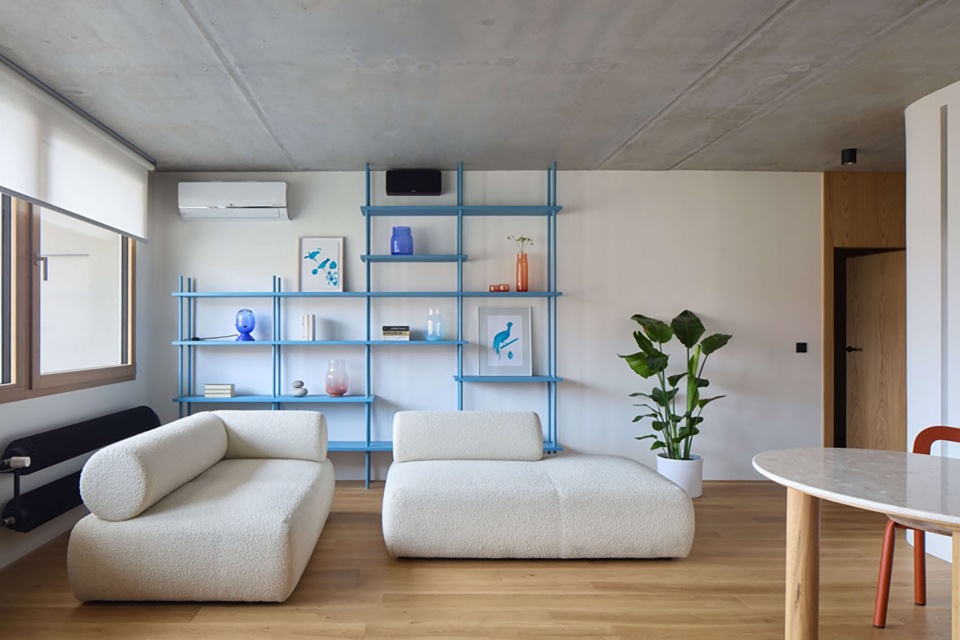 我们的目标是创造一种优雅的氛围,在鲜明的对比中兼具力量与平静。我们选择展示而非隐藏这栋板式建筑固有的混凝土。去除旧有的油漆与抹灰层后,原始的混凝土表面得以显露并被精细打磨。木质地板成为我们的“甲板”,承载日常生活的舞台。不同色调的蓝色出现在厨房、书架与照明之中,彼此略有差异,却如海水般自然流动。卧室中的泥灰抹面象征着海底或我们正驶向的沙滩。
