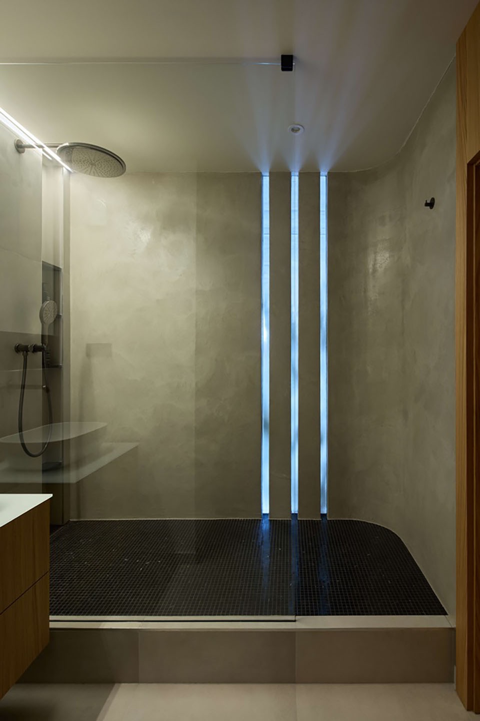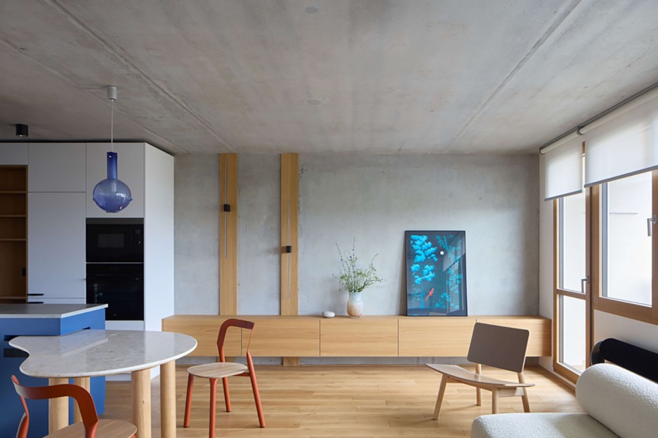 “地平线之上”项目将布拉格的一套板式公寓改造成一个以地平线、大海与运动量为灵感的优雅居所。室内设计结合了原始的混凝土、木质“甲板”、蓝色调与泥灰抹面,营造出一种对比鲜明却平静克制的极简氛围。原本的三居布局被重新设计为宽敞的两居空间,并设有步入式衣帽间,着重于实用性与精心规划的收纳系统。