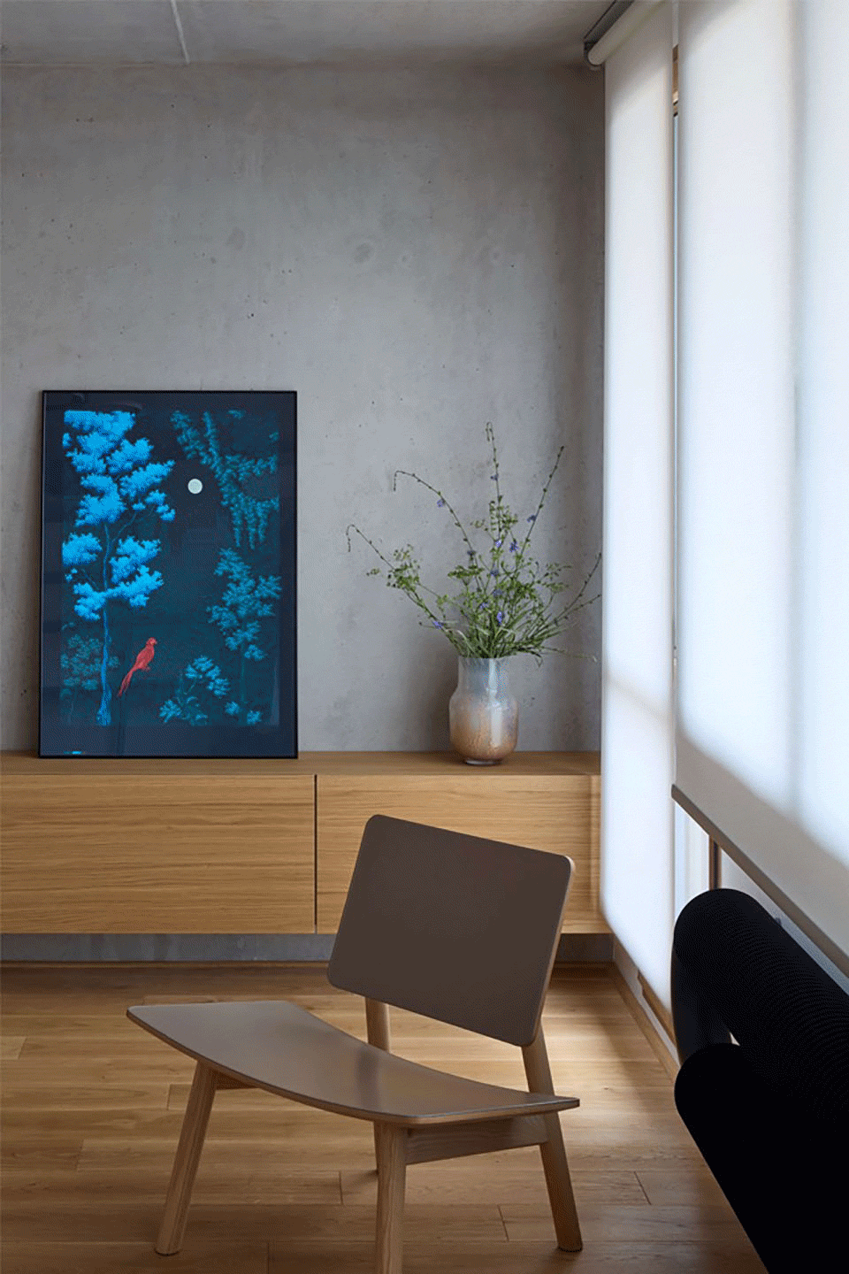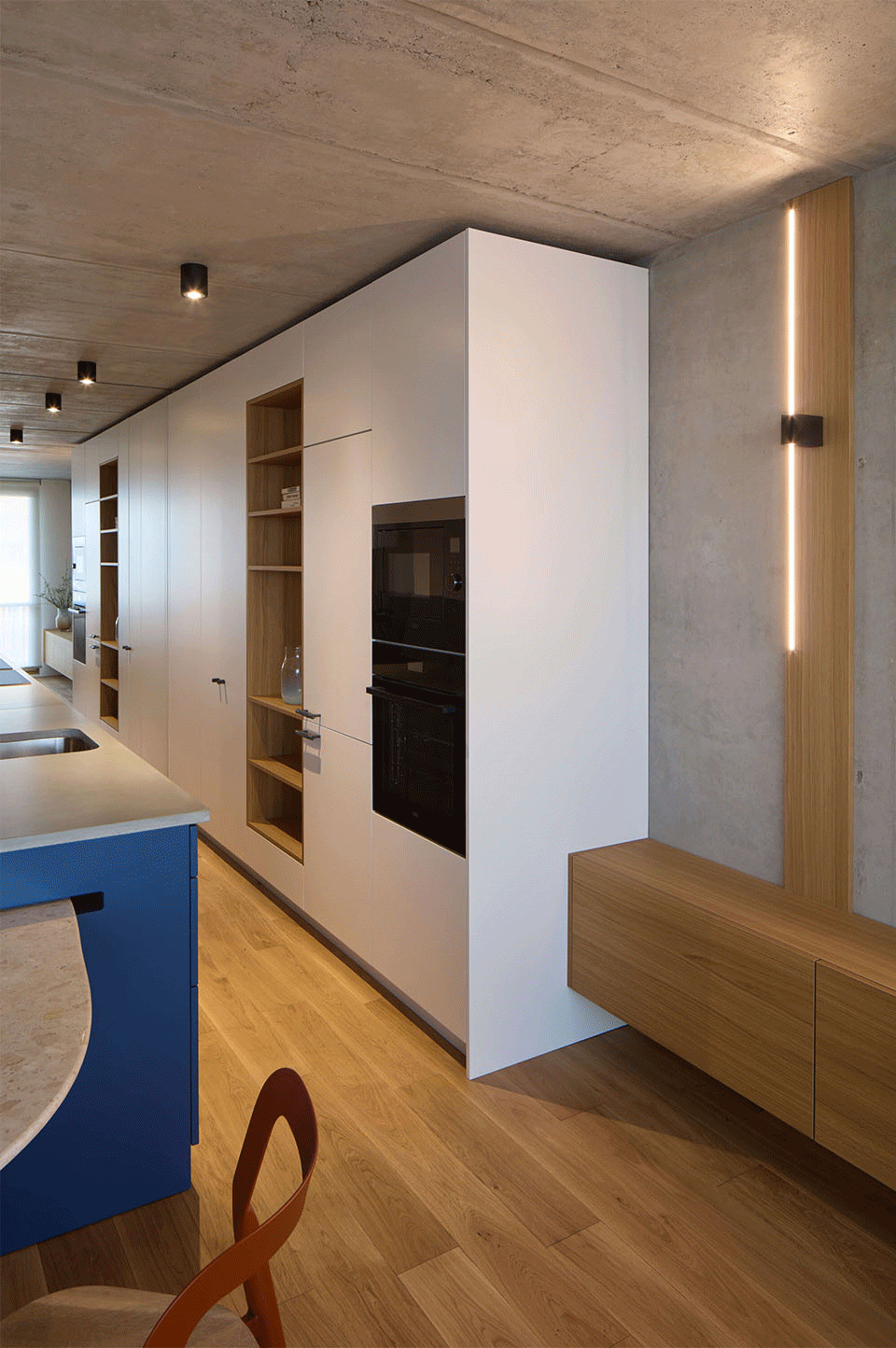 Our goal was to create an elegant atmosphere with striking contrasts—spaces that feel energizing yet soothing. We embraced the concrete inherent to the panel building rather than hiding it. After removing layers of old paint and plaster, we revealed and refined raw concrete surfaces. The wooden plank floor became our “deck,” the stage for everyday life. Shades of blue appear in the kitchen, library, and lighting—each slightly different, yet flowing into one another like the surrounding sea. In the bedroom, clay plaster represents the seabed or a beach we are sailing toward.