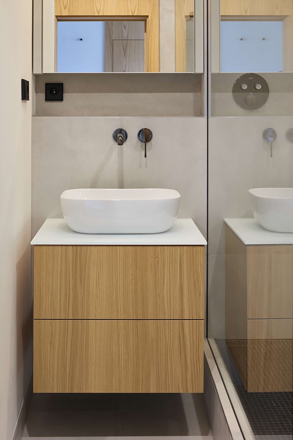 We also transformed the original three-room layout into a generous two-room apartment with a separate walk-in closet. The bathroom now features a spacious shower, while storage units were integrated around the wall-mounted toilet to maximize space. The walk-in closet provides ample storage, including a dedicated niche for a bicycle with charging capability, as well as a station for an electric vacuum cleaner.