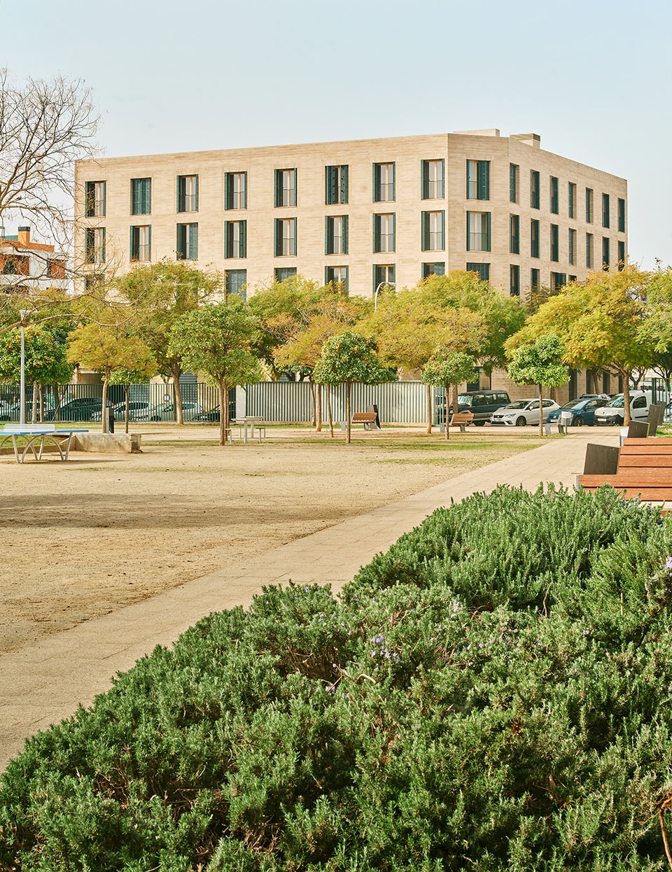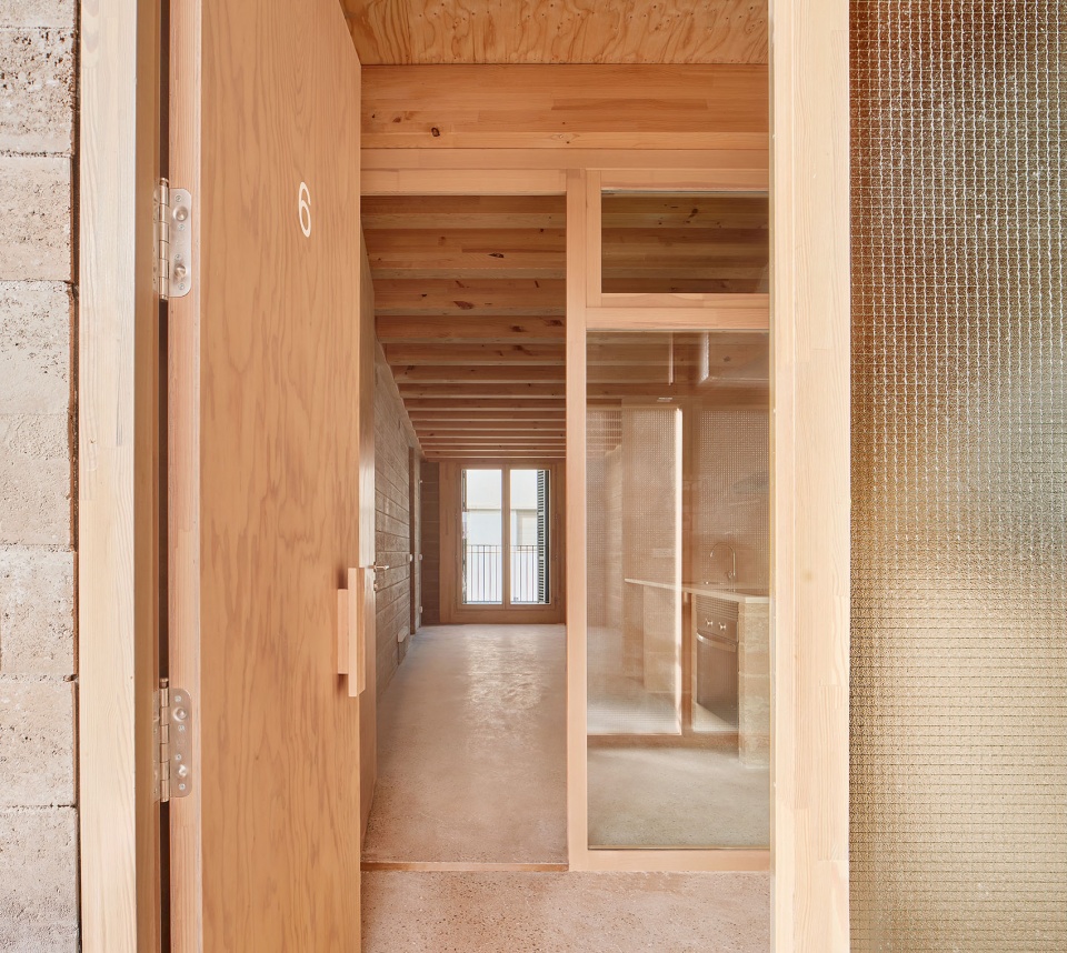 The 30+8 social housing project on Josep Togores Street in Palma de Mallorca, designed by Vivas Arquitectos, responds to the need for affordable housing from a sustainable perspective rooted in the territory. With a total of 38 units distributed across two buildings, the complex combines innovation and tradition through the use of locally produced compressed earth blocks (CEB) and wooden slabs, reducing the carbon footprint and reinforcing the island’s architectural identity.