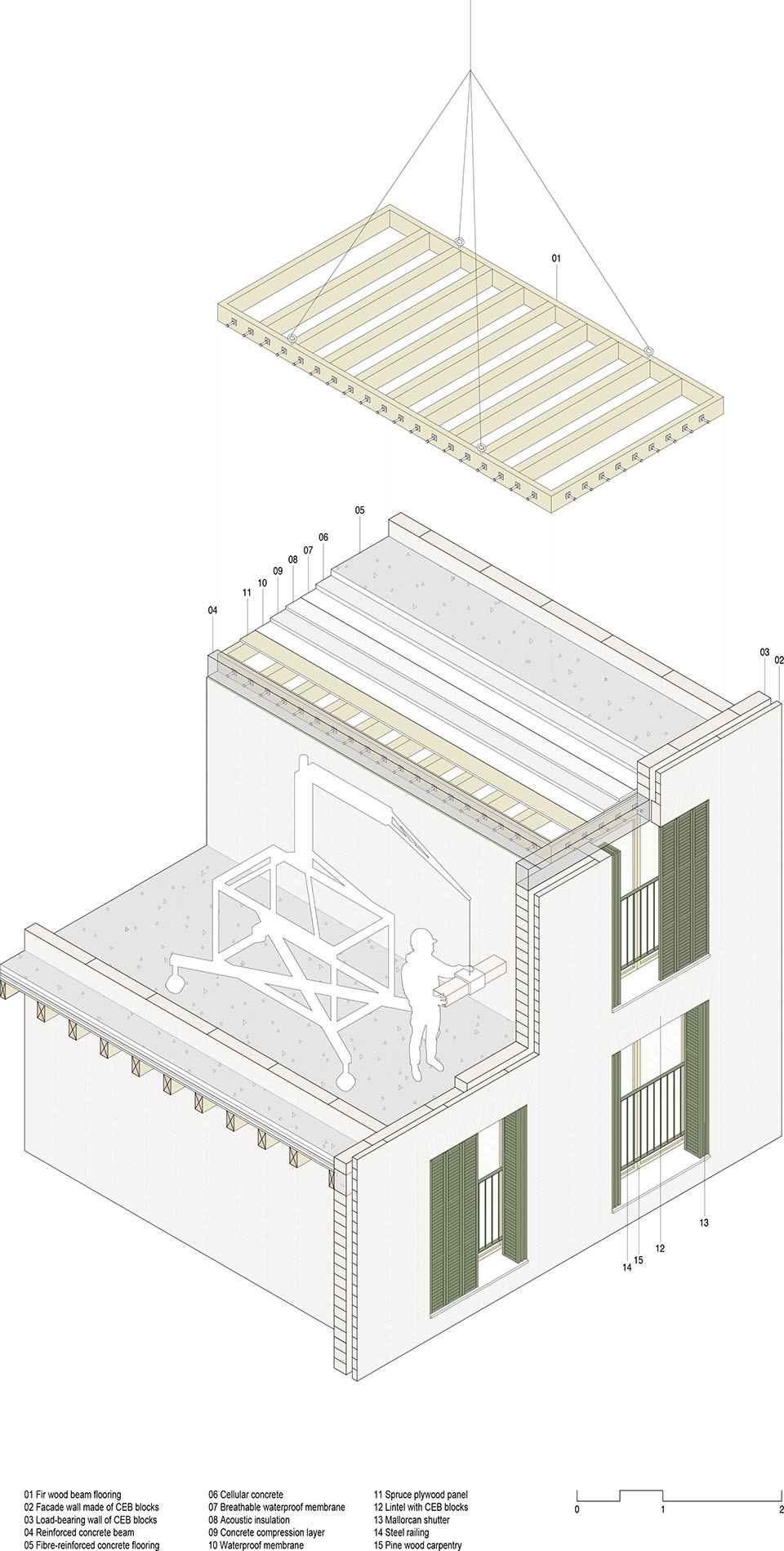 建筑结构由木质楼板与夯土块(CEB)承重墙组合而成。CEB是一种可持续且高效的解决方案,为项目带来多重优势。从环境角度看,其在马略卡岛的“零公里”本地生产(Km0)减少了运输相关的二氧化碳排放,同时促进了地方经济。此外,CEB不需要高温烧制,从而降低能耗与碳足迹。其多孔特性使墙体能够“呼吸”,改善室内空气质量并防止冷凝现象。