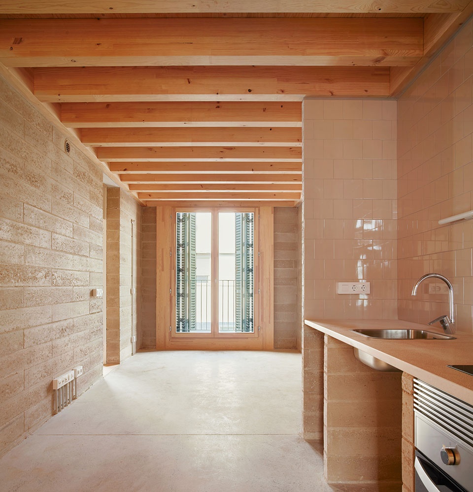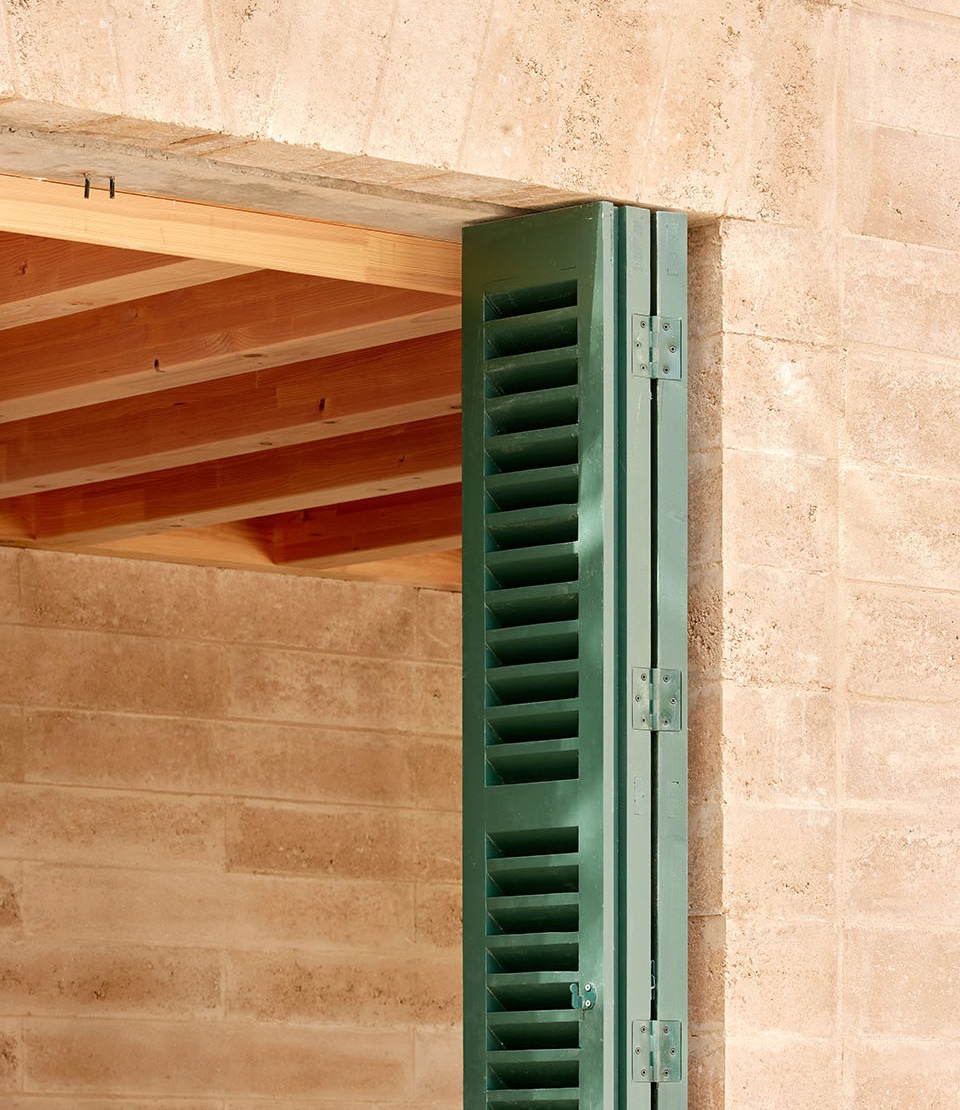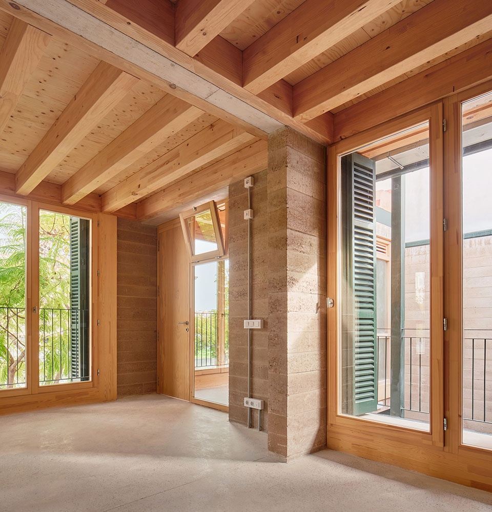 The structure combines wooden slabs and load-bearing walls made of CEB (compressed earth blocks). CEB is a sustainable and efficient solution that brings multiple benefits to the project. From an environmental point of view, its Km0 production in Mallorca reduces CO2 emissions associated with transport and promotes the local economy. Moreover, as it does not require cooking at high temperatures, it reduces energy consumption and the carbon footprint. Its porous nature allows the walls to breathe, improving indoor air quality and preventing condensation.