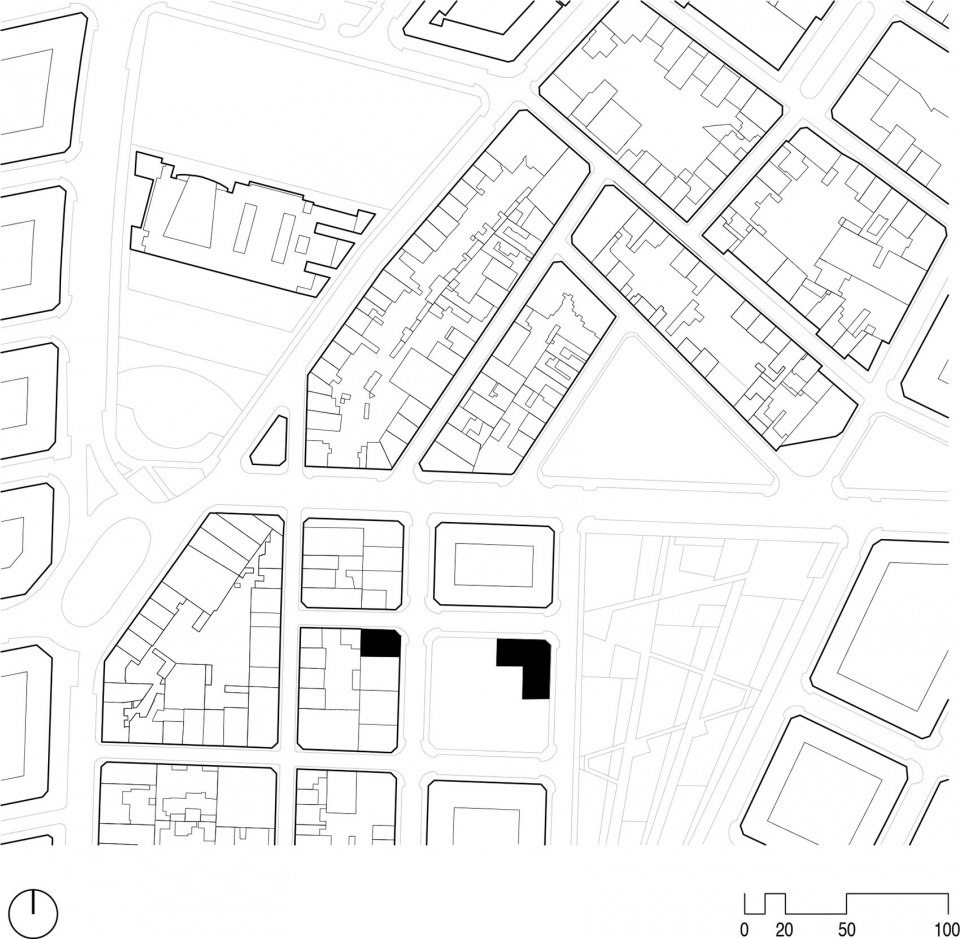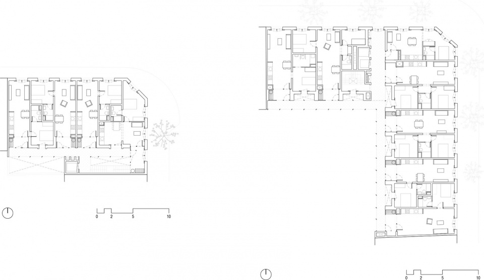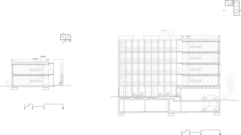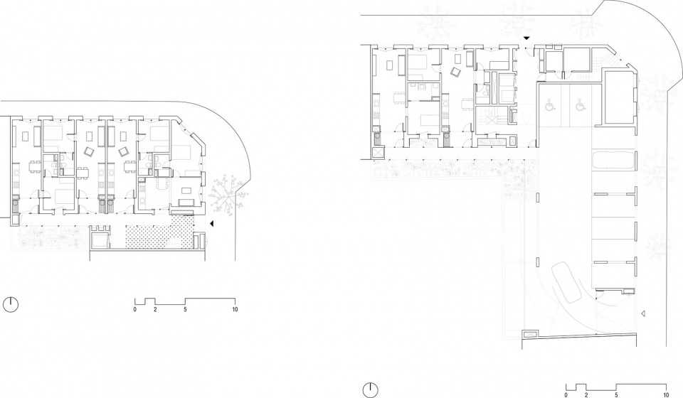 项目聚焦于两个核心方面:一是恰当地融入城市与自然环境,二是实现符合功能需求的空间布局。主楼包含30 套住房单元,位于街角地块,呈“L”形布置,建筑进深为11.5米。其地上部分包括底层及四层住宅空间,地下层及部分底层用于停车,共提供30个车位。第二栋建筑位于矩形地块上,地上两层共包含8套住宅。