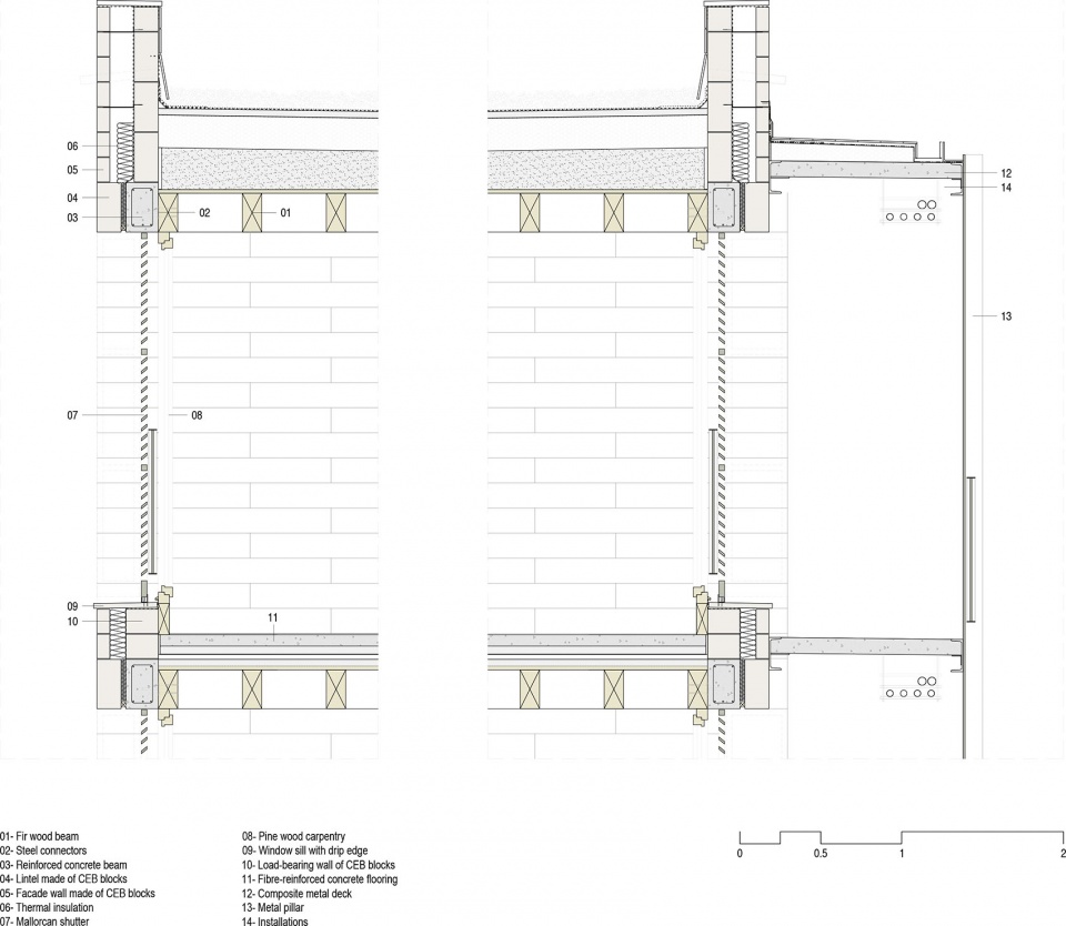 From a structural point of view, CEB offers high compressive strength, which allows the construction of durable load-bearing walls with low maintenance. It is a material that does not degrade easily and is highly resistant to fire and pests, thus improving the safety and useful life of the building. Its combination with other construction systems, such as reinforced concrete in parking areas and timber floor slabs, enables a balanced, adaptable and sustainable construction approach.