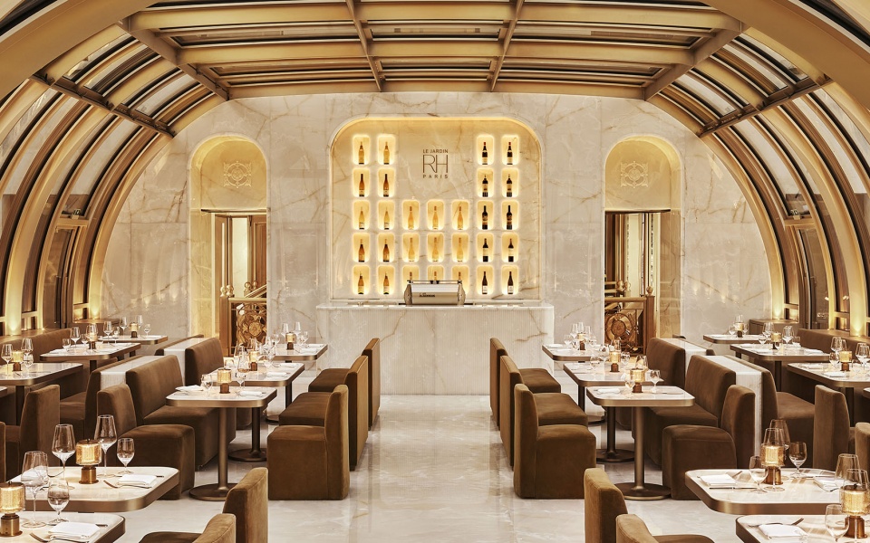 The gallery’s discreet entranceway is set back from the road and accessed via a landscaped pathway that wraps around the building. A winter garden restaurant is located on the lower rooftop level and has a fully gazed canopy, which brings an abundance of natural light into the space. The spectacular champagne bar on the upper rooftop level offers panoramic views across the city and to the Eiffel Tower. Positioned at the rear of the building, RH’s new interior design studio takes the form of a striking glass pavilion and integrates seamlessly with the landscaping.