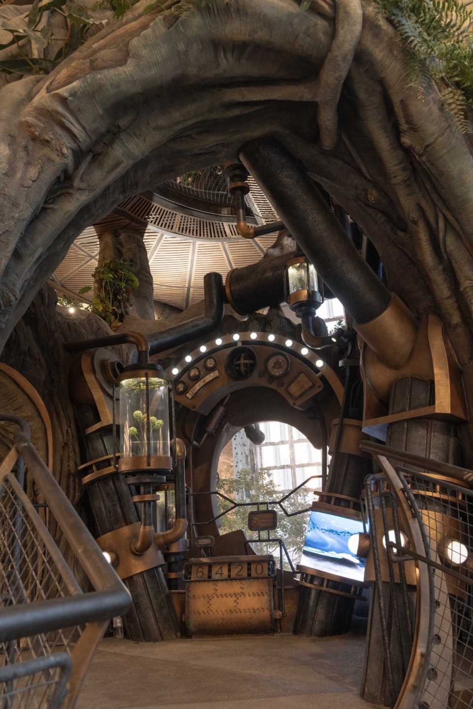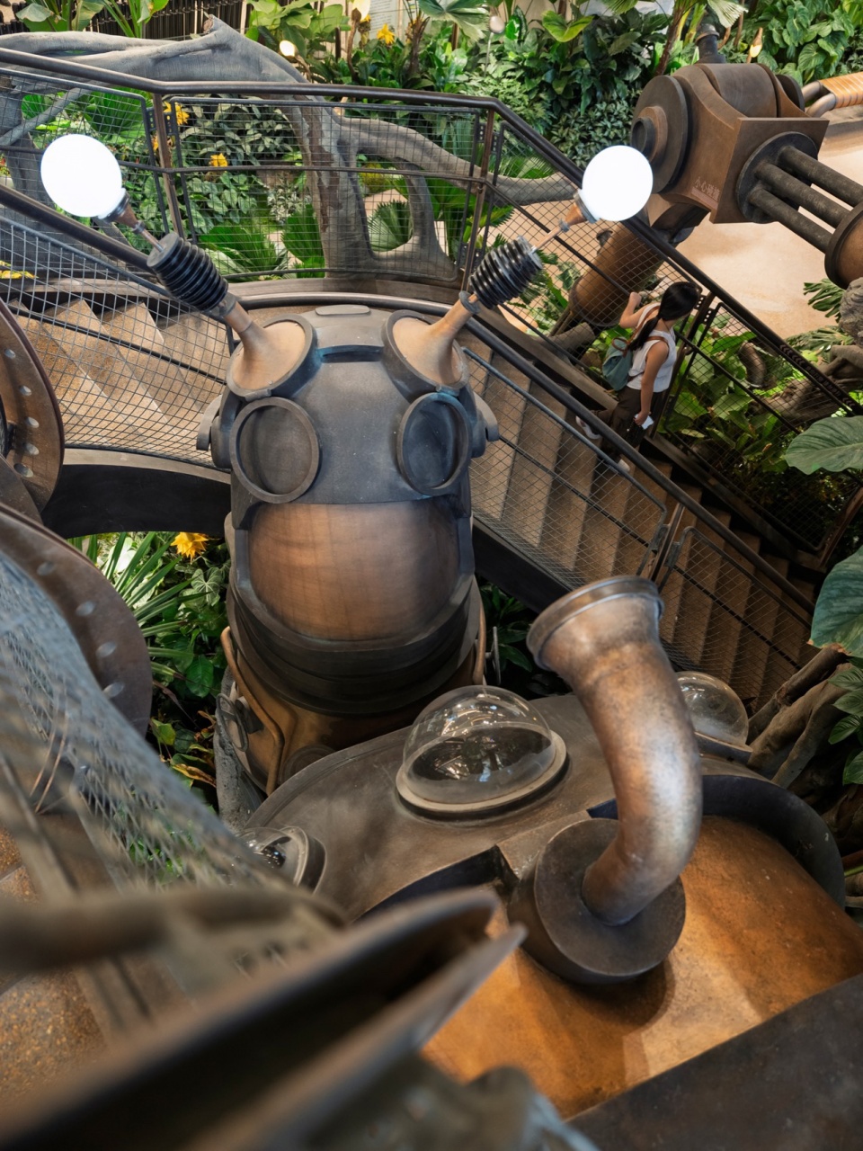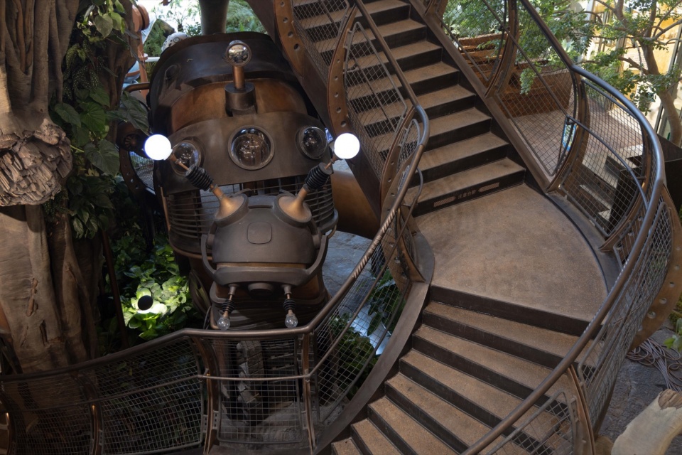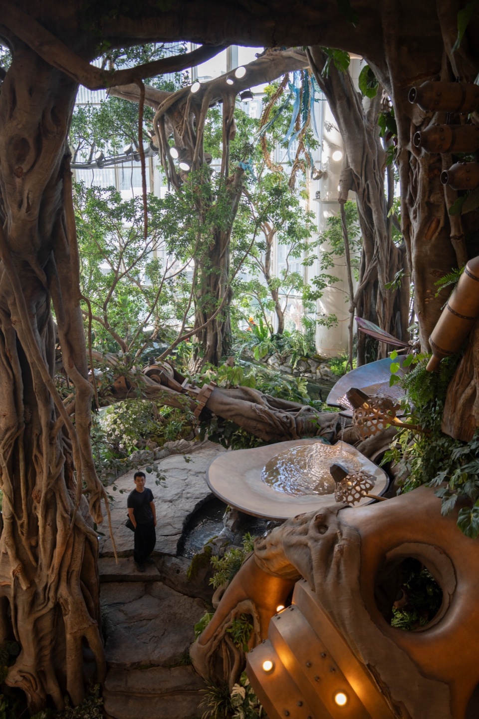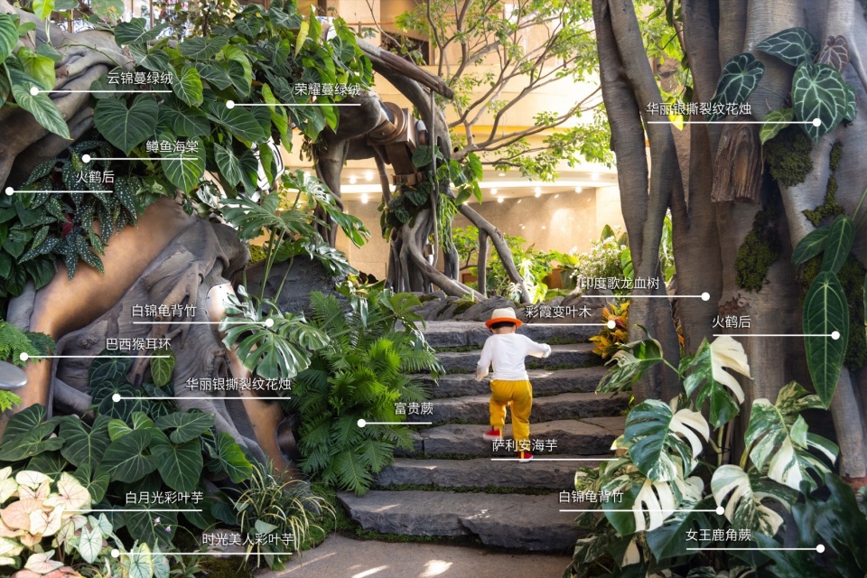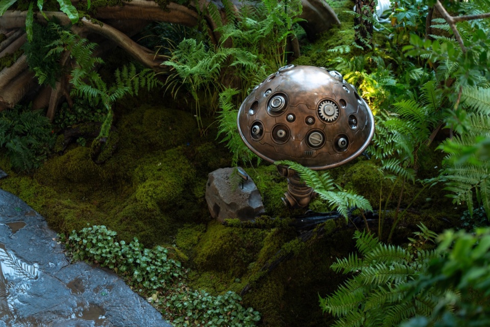 来到树根王国,一个以蕨类为植物主体的空间,库伯蕨、霸王蕨、粘叶豆、银线蕨等各种奇特的植物构建了蕨影迷踪主题植物空间,形成植物主题第二幕。拾级而上,便可走上石桥。一侧是正在送出快乐泡泡因子的螺旋泡泡花,而一侧则是机械溪谷,机械溪谷小径两侧清流漫过叠石,头顶机械枝桠抵垂,树枝上考虑了众多附生植物如女王鹿角蕨、石斛兰、孔雀铃丝薇、火鹤后超大泰国鸟巢蕨等,让世界树更具生命力。