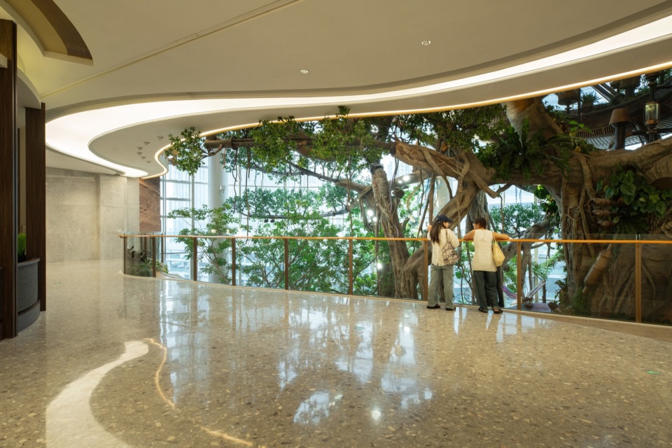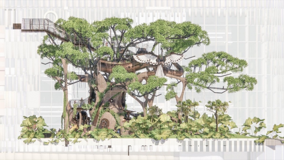 The Great Dragon Guardian coils around the tree, guarding the Wonder Tree and other creatures inhabiting it. Functionally, the dragon’s body serves as the outer guardrail panels for the three-tiered sightseeing walkway. Stylistically referencing ancient dragon totem murals, the dragon’s form is crafted through the interlocking and piecing together of panels to represent dragon scales, with circular windows set in to allow children to observe the outside through the glass.
