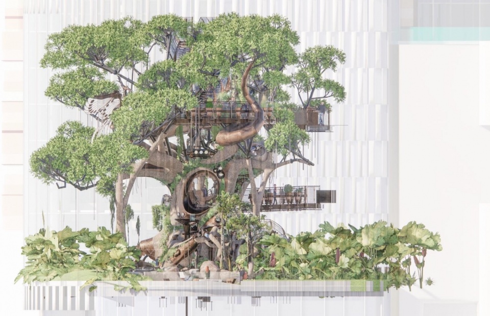 In 2021, Hongkong Land together with China Merchants Shekou commissioned WTD GROUP to lead the overall landscape design of THE RING · GARDEN CITY, Yubei District, Chongqing. As the general coordinator of the project, WTD GROUP was responsible for the full scope of the Wonder Tree scene’s landscape design from concept through to construction documents, including overall planting design, the underwater forest scheme, climbing wall design, and coordination of related disciplines.