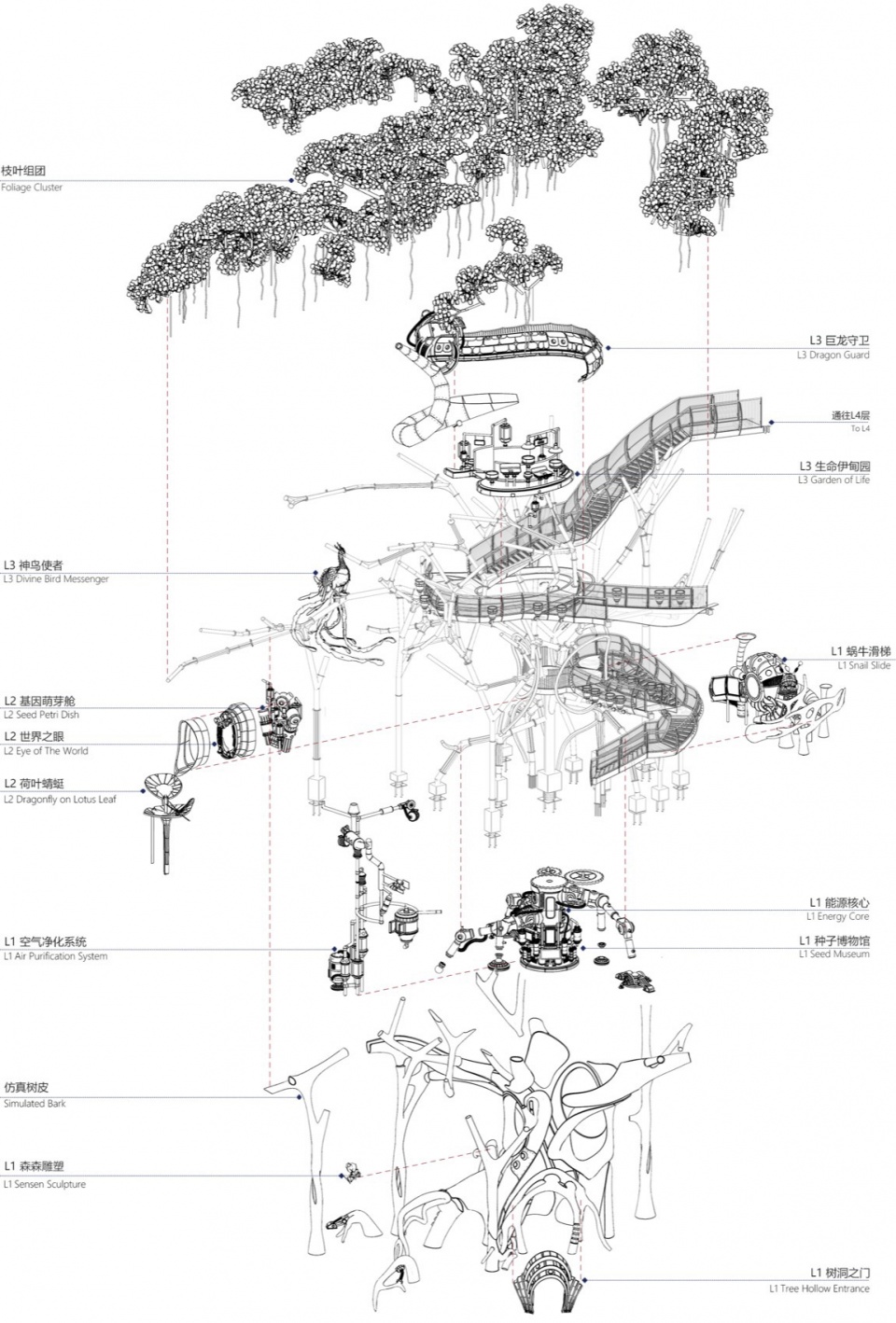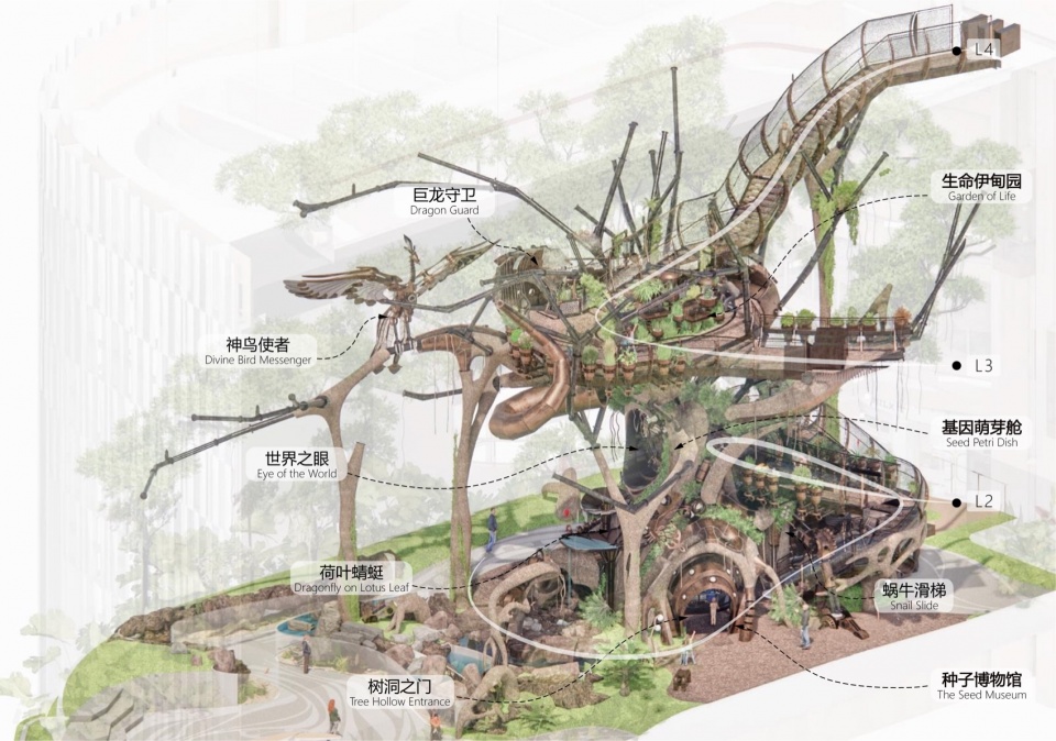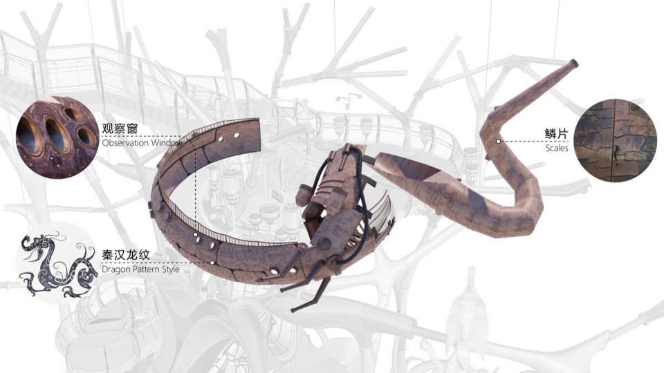 巨龙守卫盘绕在树上,守护着世界树和栖息在树上的其他生灵。龙身其功能作为三层观光步道的外围栏杆挡板,形式上参考了古代龙图腾壁画,通过板材之间的穿插拼接表现龙鳞的形式,并设置有圆形开窗,以便个子不高的小朋友通过玻璃窗口向外观察。
