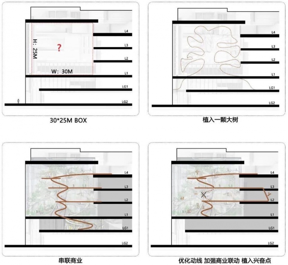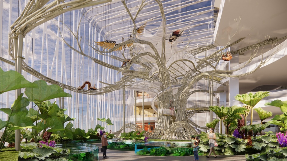 在20多米高,宽逾30米的商业室内中庭空间,世界树纵跨L1-L4层,建构起巧妙的动线设计。其内部动线首先串联起1F和2F,到2F会发现头顶3F树冠还有更多惊喜,想继续探索须从商场绕行至3F,便可抵达树冠层入口。登顶3F树冠的同时就可以顺着树冠来到4F游里天街。将世界树动线设计与商业动线巧妙的串联起来,这样世界树和商业联动会更紧密,同时也扩大世界树游逛范围。在这棵树上,机械生物与树及依附在树上生长的所有生命,共同建构起一个庞大的生命体。