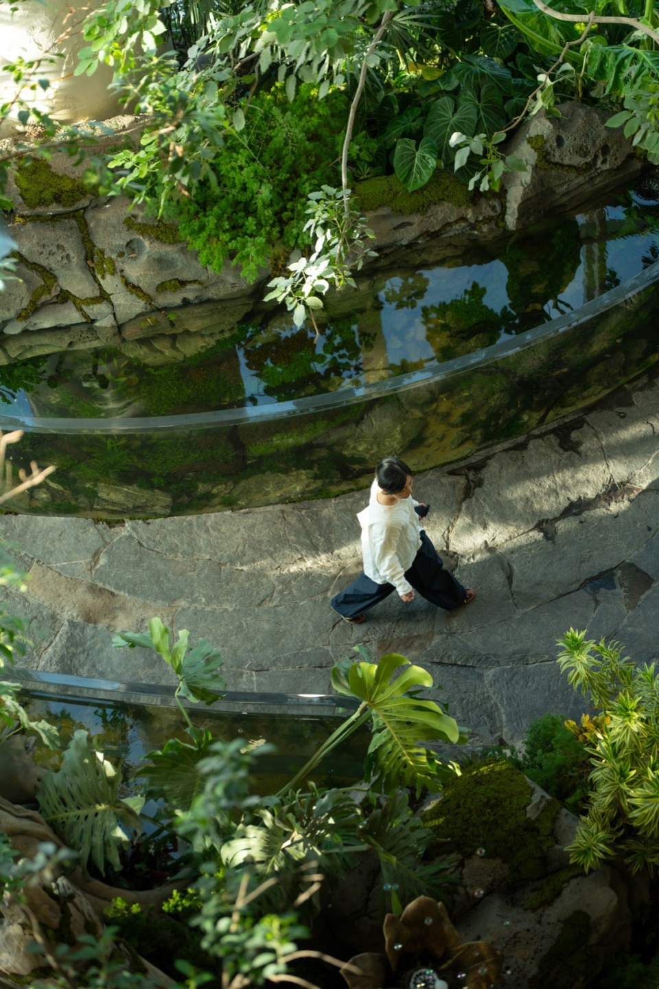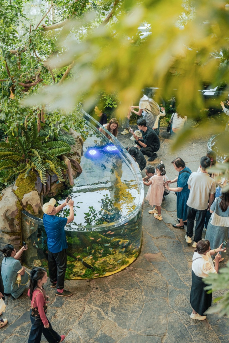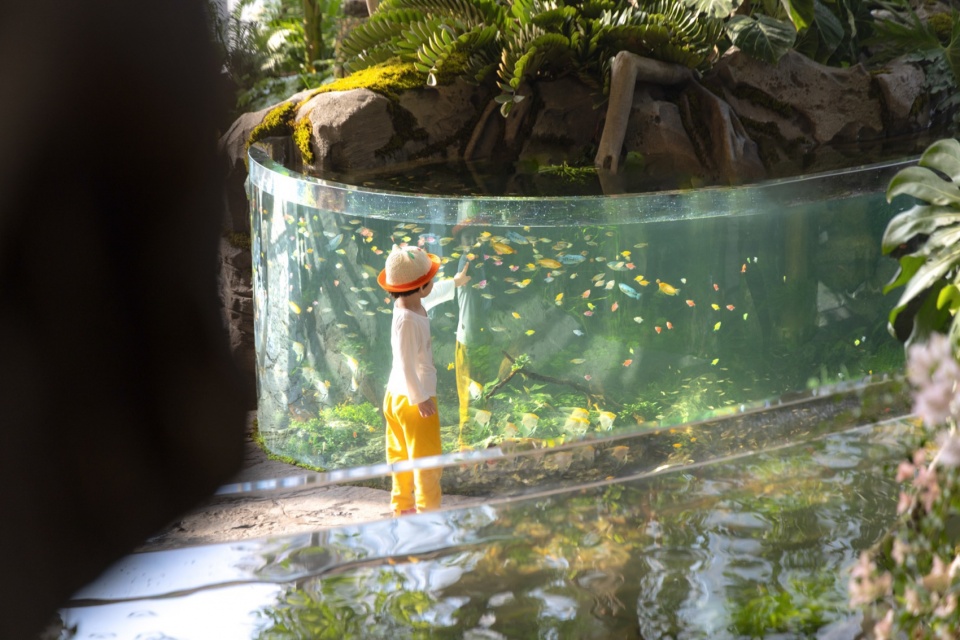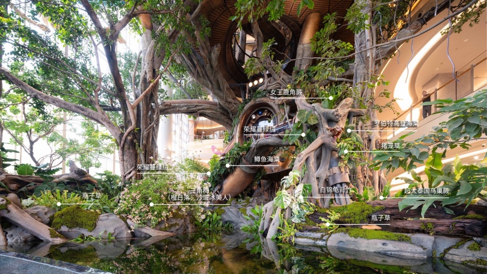 Designers specially selected the native Ficus microcarpa (Chinese banyan), whose multi-aerial-root feature perfectly matches the atmosphere of the Wonder Tree. Visitors then step into a serene aquatic forest, where the tree roots on both sides are covered with various fantastical plants—together forming the plant theme of the Tortoiseshell-Patterned Foliage Gloomy Grove. A large rainforest ecological tank, standing 1.2 meters tall and occupying 75㎡, extends the Wonder Tree’s root system, forming a submerged woodland.
