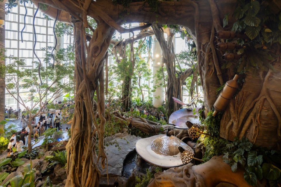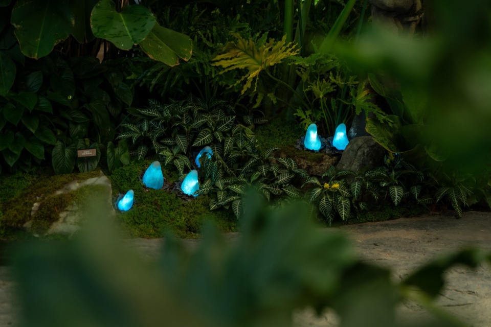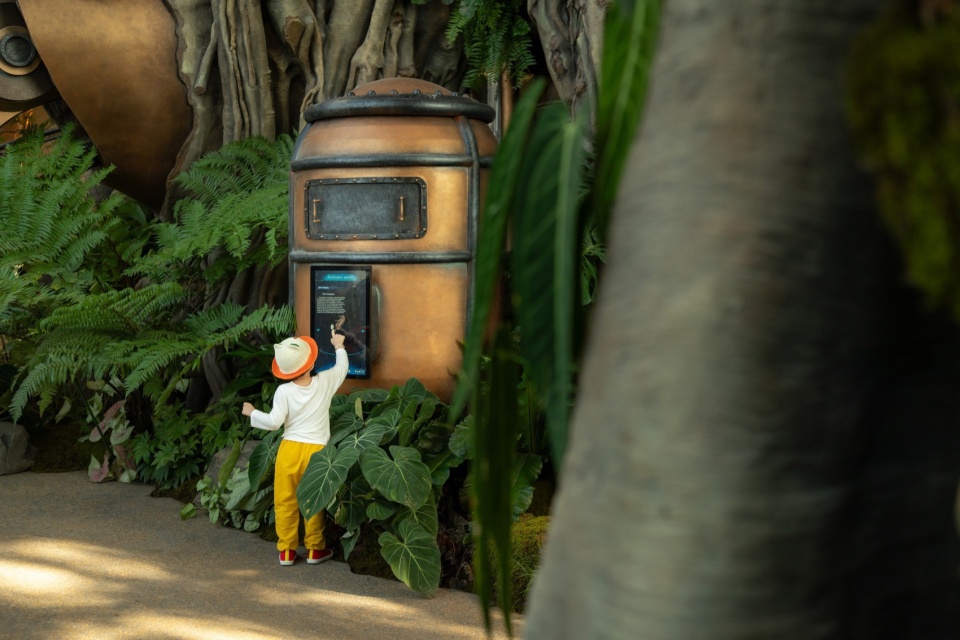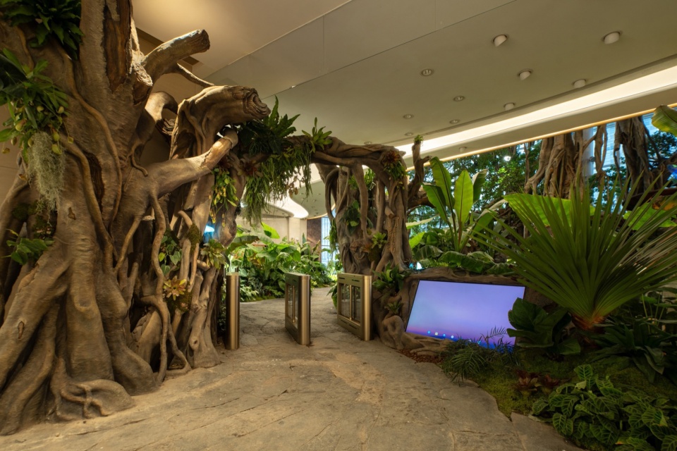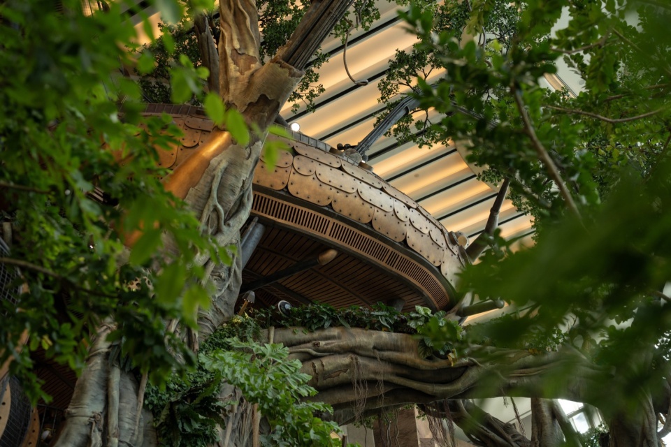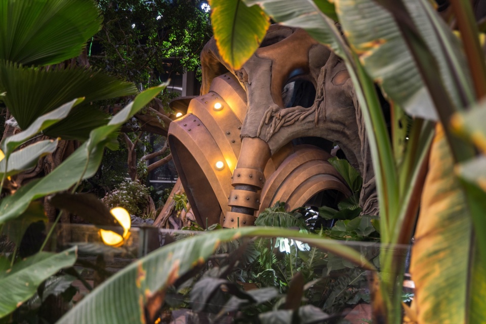 Beginning at the L1 entrance, visitors pass through the Hobbit Gate entwined with roots and are immediately enveloped by enormous leaves. This area, themed as a “Hobbit Forest,” is populated by a variety of taro plants—large-leaved Colocasia gigantea (Blume) Hook, Ensete glaucum (Roxb.) Cheesman, and Philodendron melanochrysum Linden et André—all contributing to a lush atmosphere. Further into the verdant plant clusters, the mysterious blue crystal taro plants intermittently shimmer, making visitors feel as though they’ve been miniaturized and transported to a fantastical world. Following the vines forward, the view suddenly opens up. A 20-meter-tall mechanical tree stands before the eyes, its intricate roots anchored deep in the water below, with rare and precious plants growing from tree crevices. A divine bird perches atop this forest, as if stepping into a mechanical enchanted woodland.