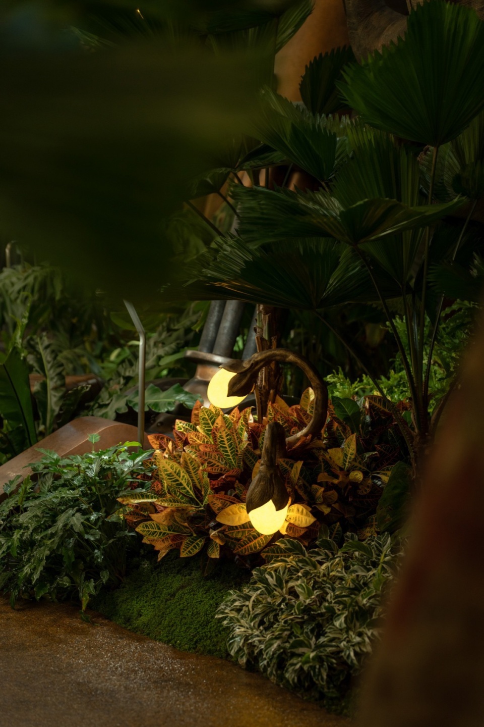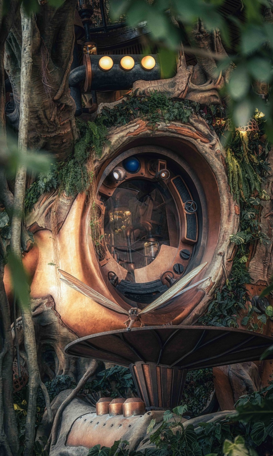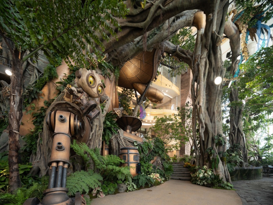 Beginning at the L1 entrance, visitors pass through the Hobbit Gate entwined with roots and are immediately enveloped by enormous leaves. This area, themed as a “Hobbit Forest,” is populated by a variety of taro plants—large-leaved Colocasia gigantea (Blume) Hook, Ensete glaucum (Roxb.) Cheesman, and Philodendron melanochrysum Linden et André—all contributing to a lush atmosphere. Further into the verdant plant clusters, the mysterious blue crystal taro plants intermittently shimmer, making visitors feel as though they’ve been miniaturized and transported to a fantastical world. Following the vines forward, the view suddenly opens up. A 20-meter-tall mechanical tree stands before the eyes, its intricate roots anchored deep in the water below, with rare and precious plants growing from tree crevices. A divine bird perches atop this forest, as if stepping into a mechanical enchanted woodland.