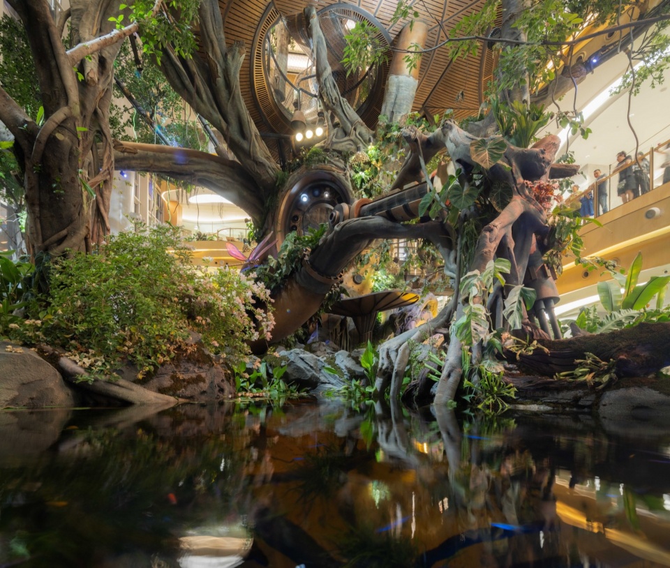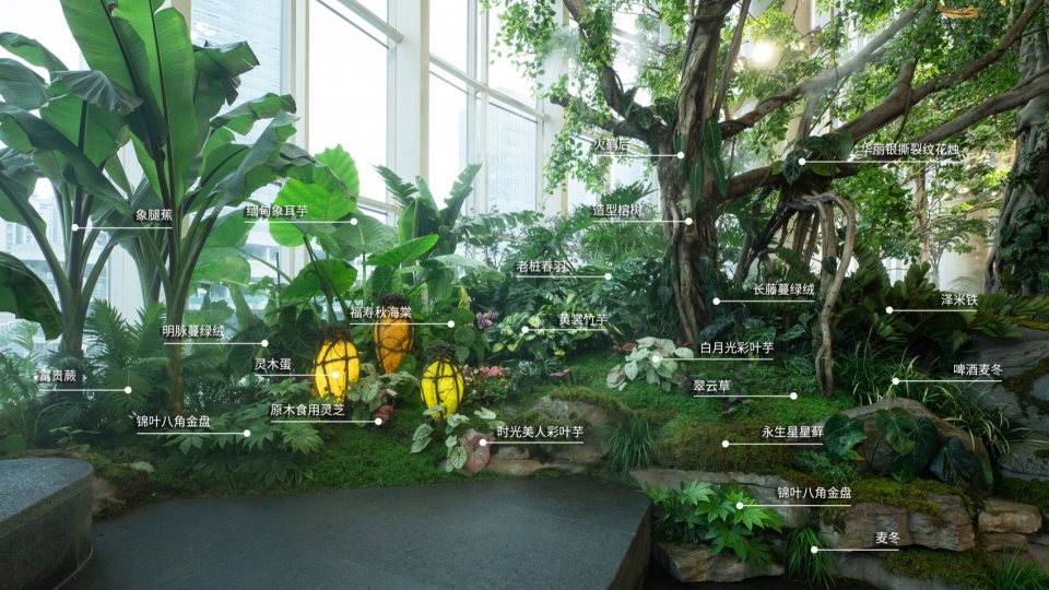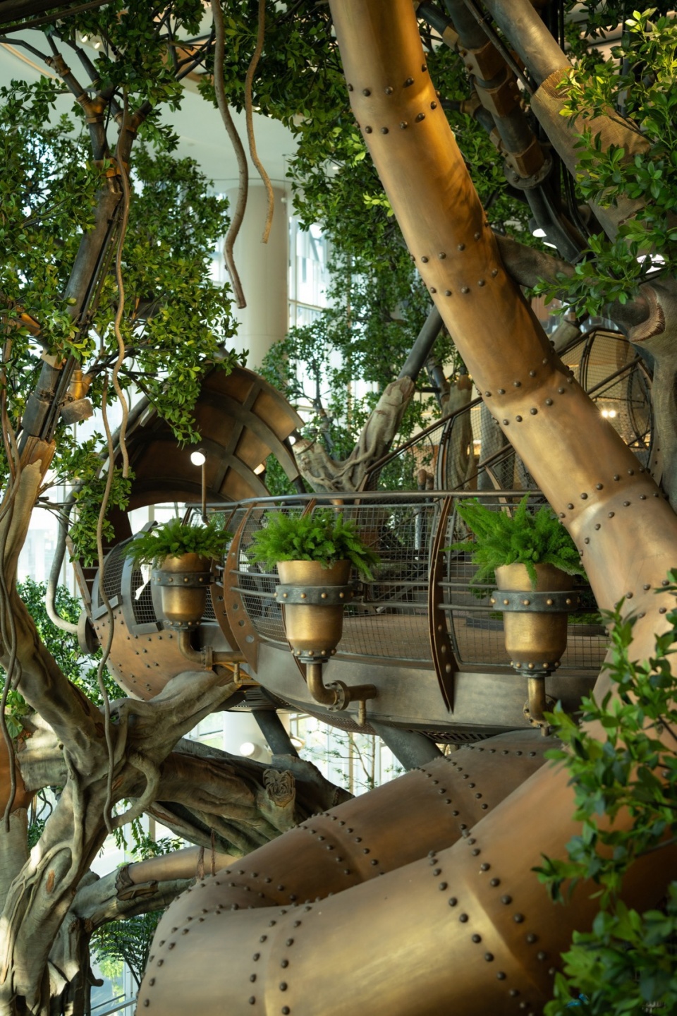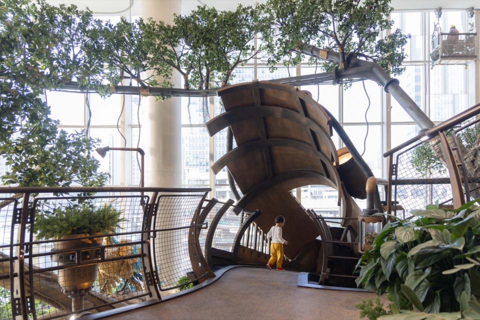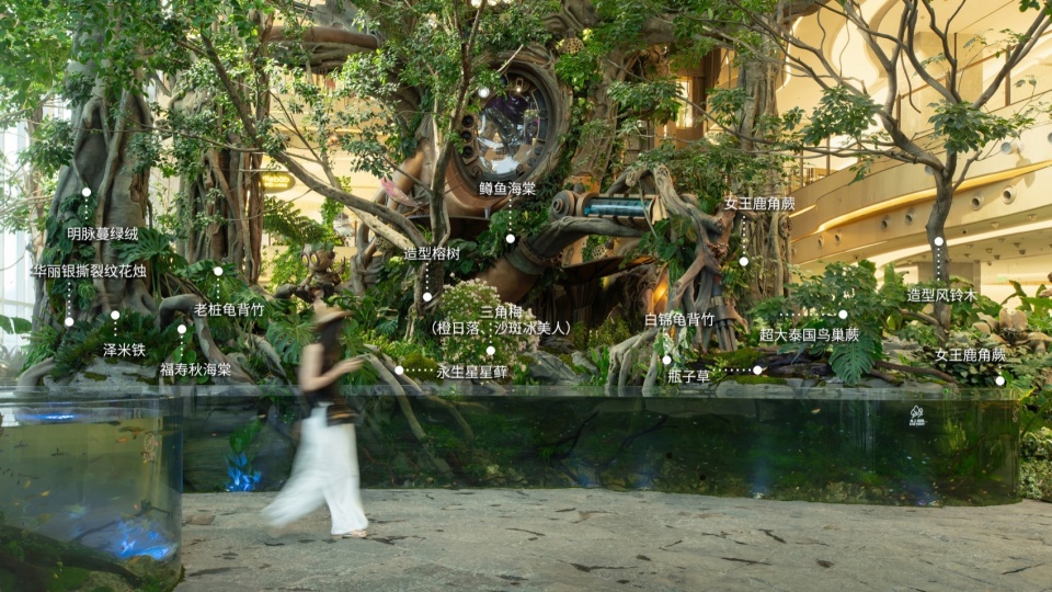 一座纵跨4层商业空间,20M高的世界树巨大装置在建筑内部生根,将蒸汽机械与奇幻森林相结合,200多种奇花异草在机械脉络中蓬勃生长,构建出一个超4000立方米的可游可触的立体生态空间。人们可以上下穿梭在这样一处童话般的奇异世界里,感受人类科技发展与自然共生交融的震撼生命力。