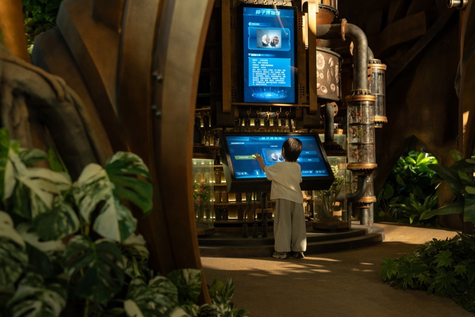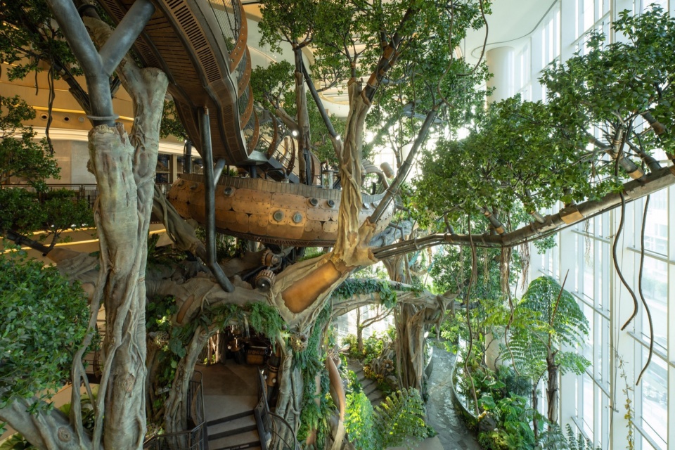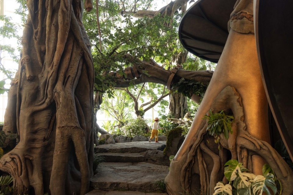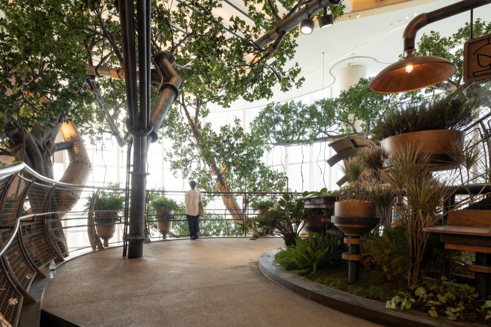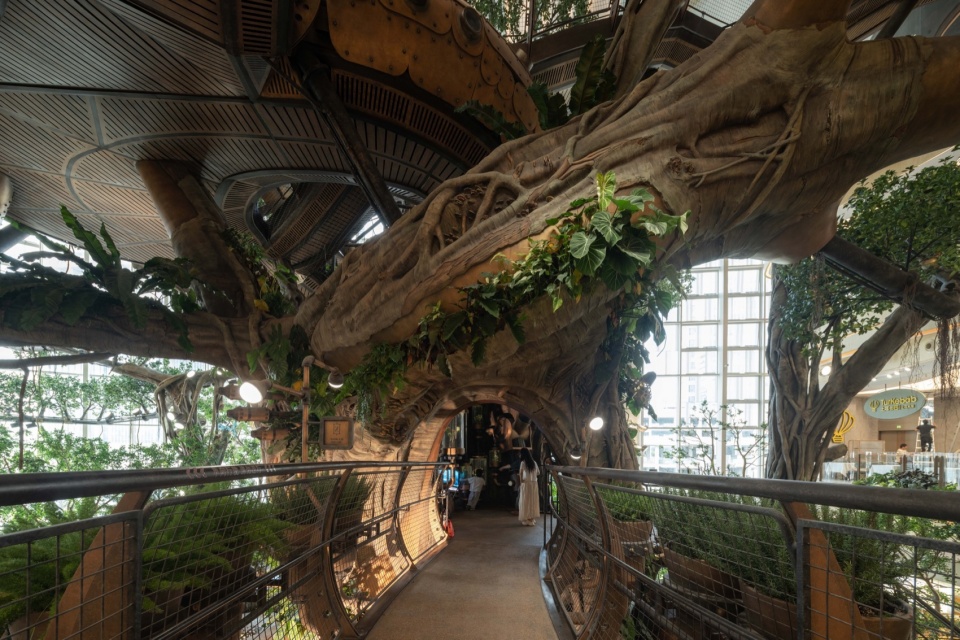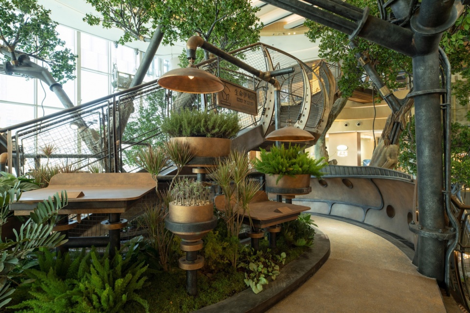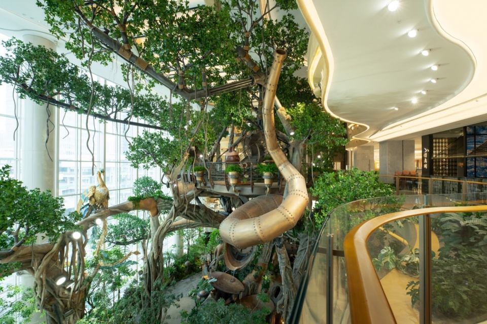 A 20-meter-tall Wonder Tree mega-installation takes root within the building, spanning four levels of retail space. Steampunk elements combine with a fantasy forest where more than 200 fantastical plants flourish along the mechanical “veins,” forming a 4,000+ m³ 3D ecological space that enables visitors to explore in an immersive and multi-sensory manner. People can wander up and down in this fairytale-like wonderland, while experiencing the awe-inspiring vitality of the symbiosis and integration between human technological development and nature.