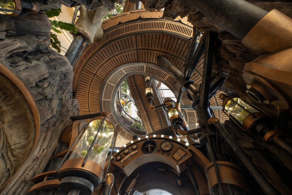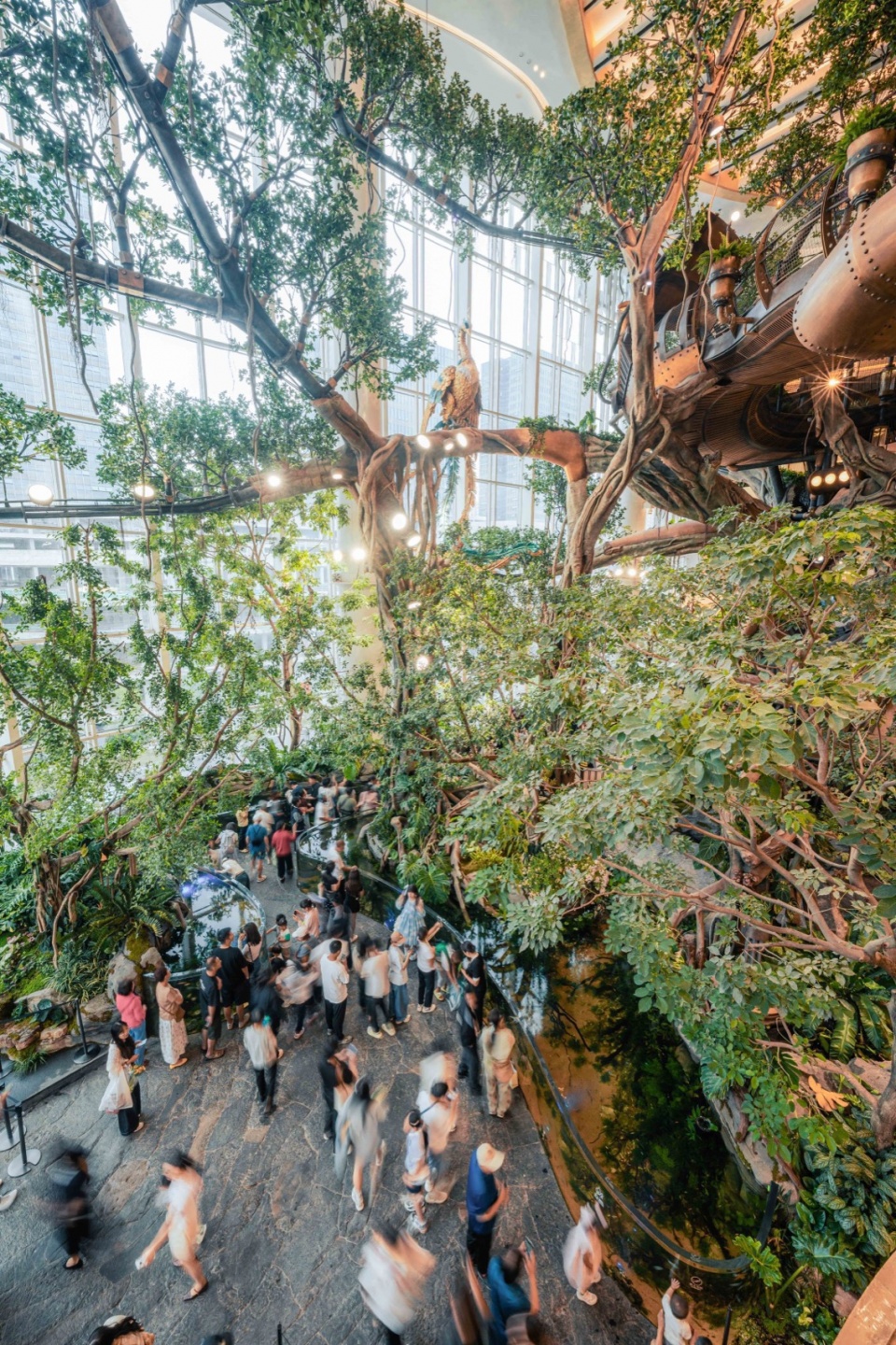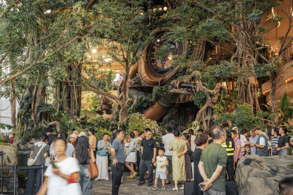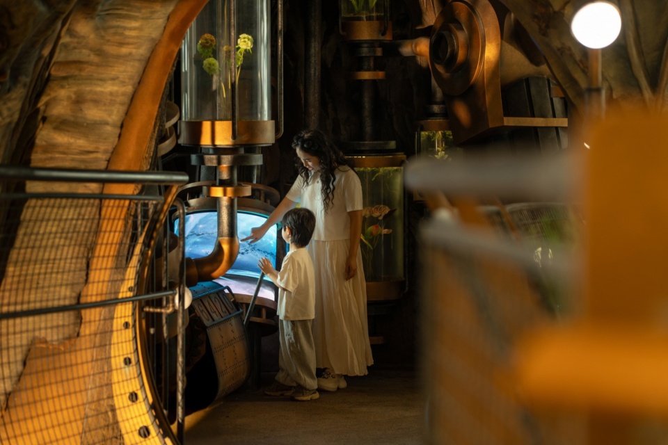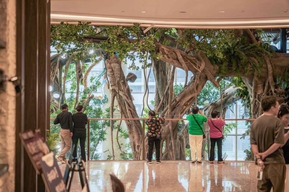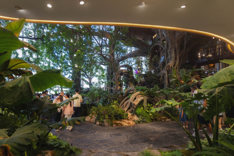 A 20-meter-tall Wonder Tree mega-installation takes root within the building, spanning four levels of retail space. Steampunk elements combine with a fantasy forest where more than 200 fantastical plants flourish along the mechanical “veins,” forming a 4,000+ m³ 3D ecological space that enables visitors to explore in an immersive and multi-sensory manner. People can wander up and down in this fairytale-like wonderland, while experiencing the awe-inspiring vitality of the symbiosis and integration between human technological development and nature.