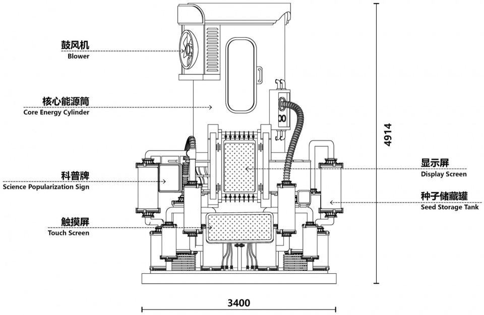 In terms of interaction, visitors tap the touchscreen below to select the names of plant seeds from various natural origins. The display screen above then plays corresponding educational content about the chosen seed. Meanwhile, the two “Seed Storage Tanks” rotating slowly on either side will position themselves in the correct orientation, ensuring the chosen seed faces the operator. A single beam of light will precisely illuminate the selected seed.