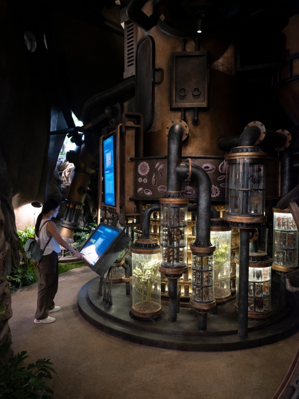 世界树的首层入口,从外部看是金属机械和缠绕的树根有机结合的树洞大门。进入之后,首层的内部空间,设定上是世界树能源核心的部位。为了延续地球的生态,世界树收集、储存了无数植物的种子,并用自己的本体树液能量为种子营造长久的储藏环境。 这里光环花园城真实地线下联合了重庆当地自然博物馆,历时半年走过黑龙江,宁夏,大兴安岭,西双版纳,收集了上百种珍稀种子,以现场互动交互的呈现方式,容许游客近距离参观和了解这些珍贵的生命信息。