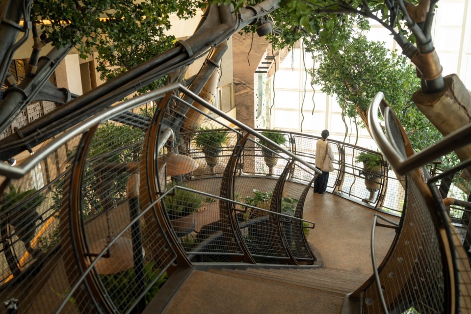 The mechanical snail itself is also a play installation for children. Childrencan ascend into its shell via a dedicated spiral staircase, look outside through a periscope, or slide down a cylindrical slide. This layout forms a secure, circular play route that is easy for guardians to supervise. The snail’s head and antennae stretch out from the inner side of the Wonder Tree’s main staircase, as if curiously peeking at people going up and down the stairs, creating a whimsical interaction.