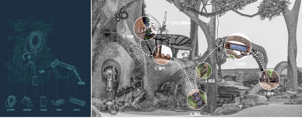 The semi-mechanical tree roots extending into the water can be used for educational displays on water purification. The Wonder Tree draws polluted water through roots, first removing sediment and big particles via rotational centrifugation, then subjecting the water to mechanical filtration and constant-temperature heating to create optimal conditions for microbial purification. Subsequently, the water is purified in biological purification tanks located at the root joints. Impurity metabolites are returned to the soil as fertilizer, while purified water is aerated, sterilized, and stored in tanks at the tree base. Finally, it integrates into the Wonder Tree’s purified sap and flows out through the World Eye waterfall, returning to the ecosystem and completing the closed-loop cycle.