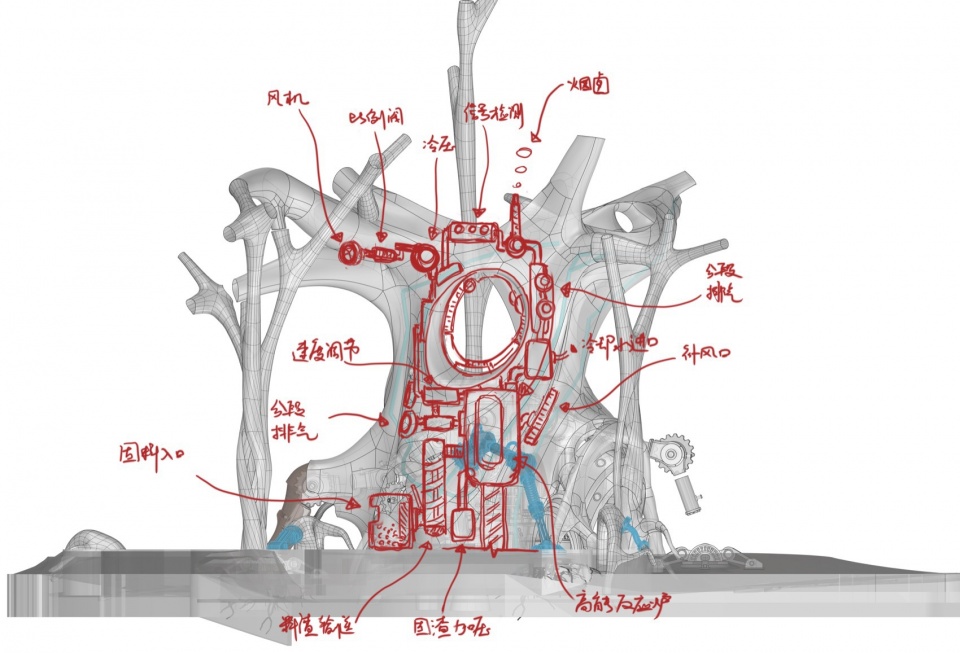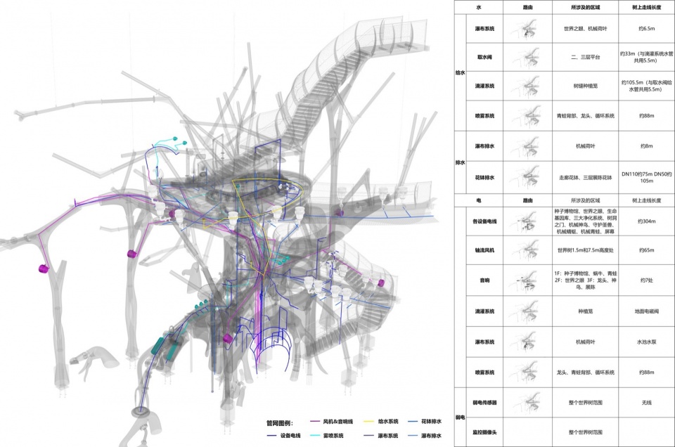 设计团队在树体内部,通过一套吻合空气净化系统节点设定的综合管线系统,将多组设备功能整合为一体。节点设计上包括有进气口,冷压装置,检测信号灯,分段排气阀等。其四通八达的机械管网体系,在延续了蒸汽朋克风格效果的同时,同样也为实际水电管线的铺设穿行提供了隐蔽路径。