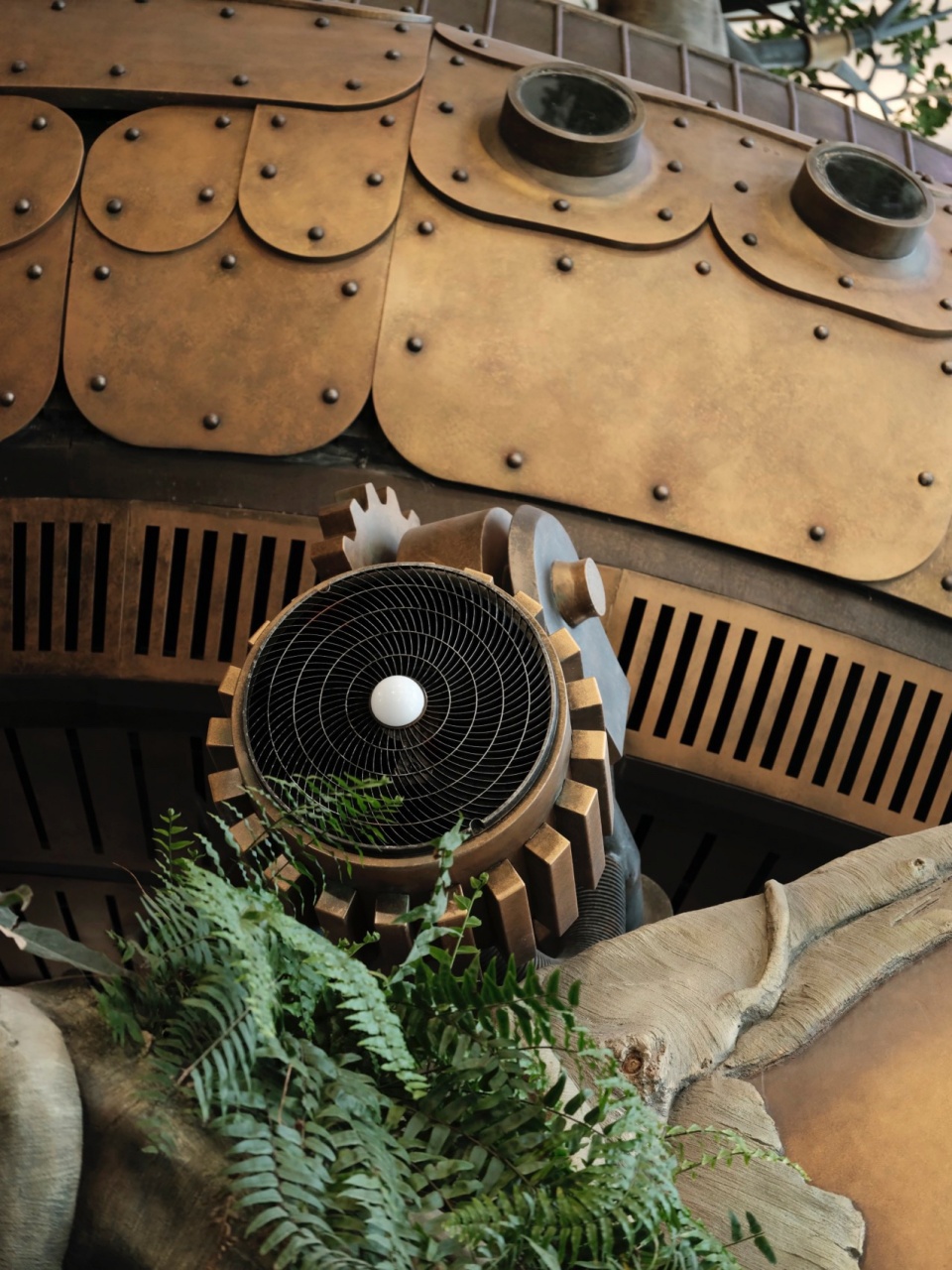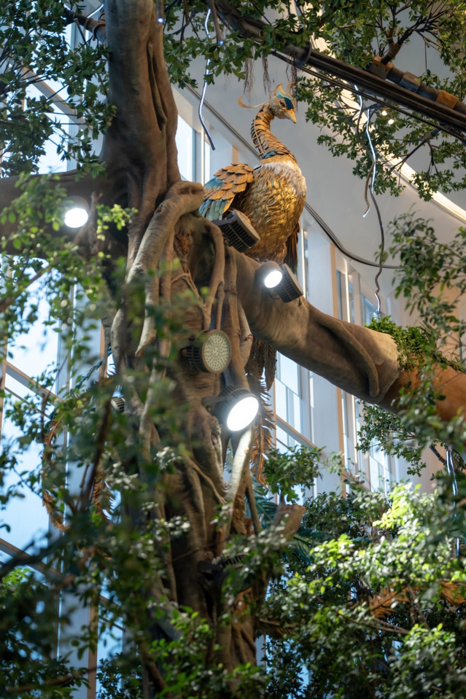 世界树所在的中庭空间,需要在树上装备多组轴流风机以加速室内空气流动,帮助空气循环的同时,也有利土壤水分挥发,保障室内植物的生长状态。对于这些刚需的风机设备,以及植物补光灯,树上照明灯等,需要整体纳入风格统一的设计考量。