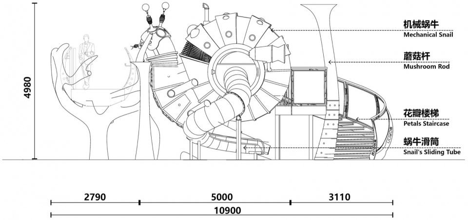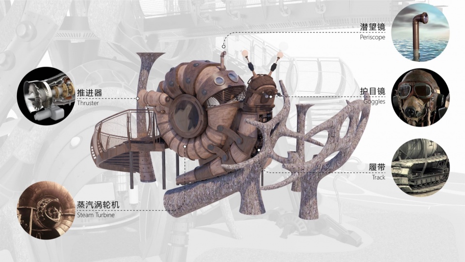机械蜗牛本身也是一件儿童可以参与玩耍互动的游戏装置,从专属螺旋小楼梯向上进入蜗牛壳内,可以通过潜望镜向外观察,也可以从圆筒滑梯一滑而下,形成闭环的方便看护的儿童玩耍流线。蜗牛的脑袋触角从世界树主楼梯步道的内侧探出,像是张望着上下楼梯的人类,形成奇妙的对话。