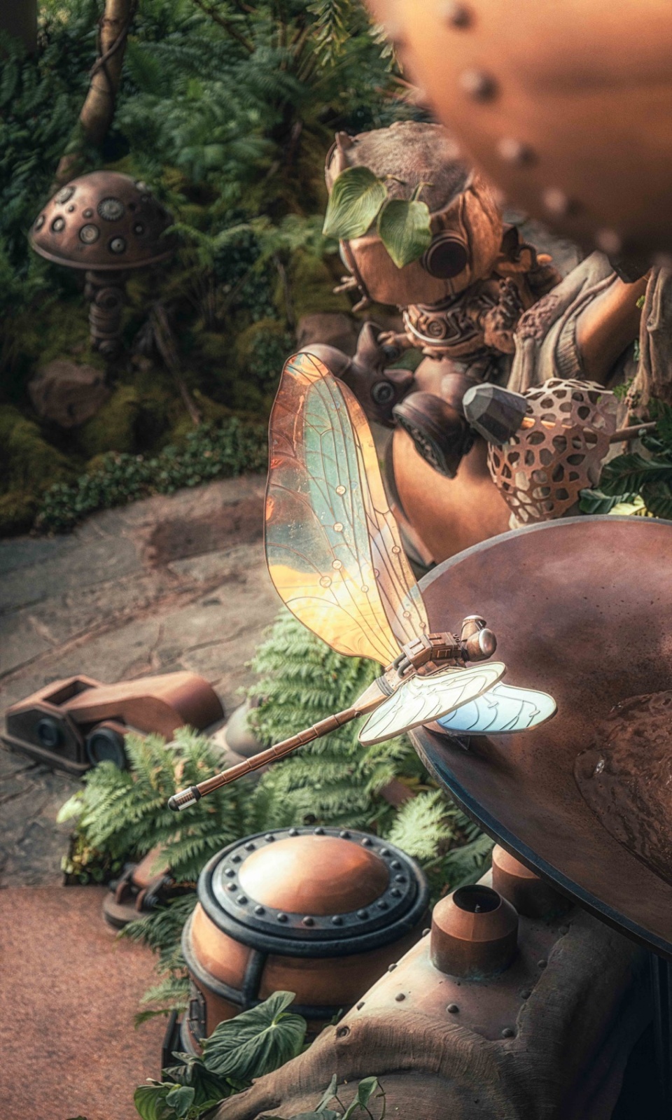 The mechanical dragonfly is designed as a maintenance technician that works in coordinated swarms. It carries a maintenance backpack on its back, and its goggles reference the dragonfly’s unique compound eyes. The wings are made of translucent colored material, adding a vivid touch of color to the predominantly metallic copper-toned environment.