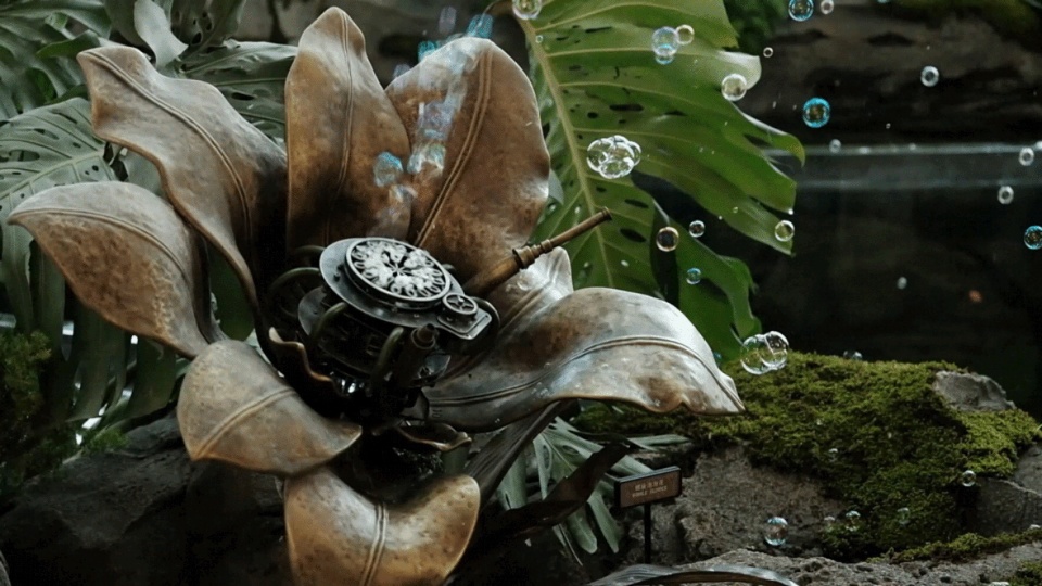 Entering the Root Kingdom, visitors come to a space dominated by ferns. Various unique plants such as Polystichum kruckebergii, giant fern, Schizolobium parahyba, and silver fern create a themed plant space called “Fern Shadow Maze,” Act Two of the botanical journey. Step onto the stone bridge, on one side is the Spiral Bubble Flower, emitting joyful bubbles; on the other is the Mechanical Valley, where clear streams flow over stacked stones along the pathway. Overhead, mechanical branches hang down, adorned with numerous epiphytic plants such as Platycerium wandae, dendrobium orchid, peacock fern, anthurium, and the giant Thai bird’s nest fern, adding even greater vitality to the Wonder Tree.