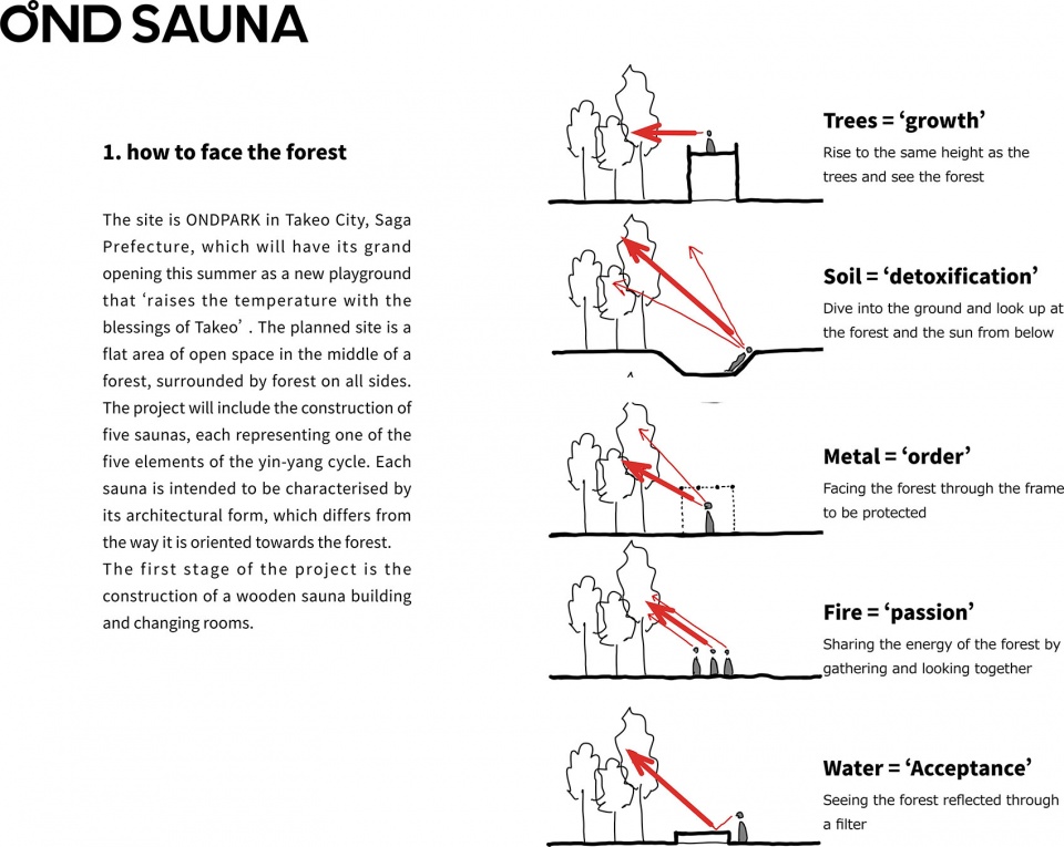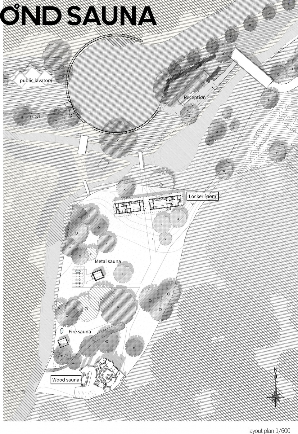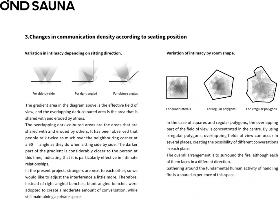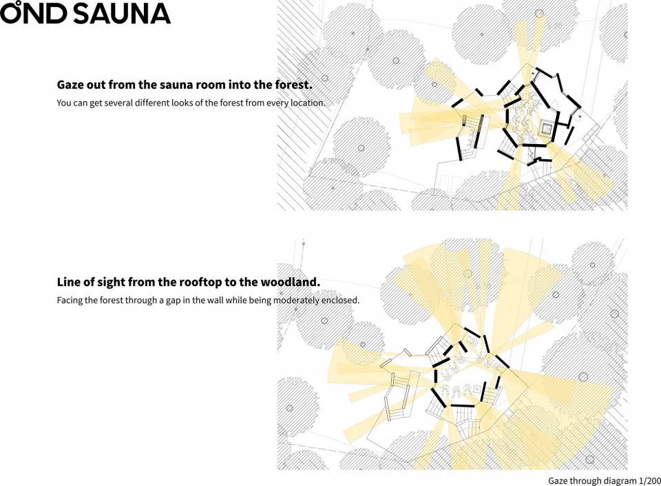 In a sauna, strangers sit nearly naked in close proximity, creating potential intimacy. Yet in Japan, public saunas haven’t fostered this sense of community. By aligning with Japan’s unique sense of closeness, we aim to create a sociopetal space, encouraging shared understanding without forced intimacy. “Non-intrusive” walls balance connection and separation; their verticality resonates with the forest, while their spacing draws nature in and modulates closeness among neighbors.