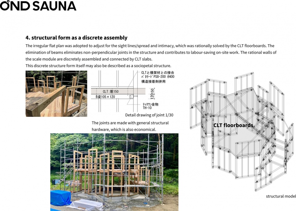 The irregular plan was chosen to allow the passage and expansion of the line of sight and to adjust the degree of intimacy, which was rationally solved by the 150mm CLT floor slab. The elimination of beams has eliminated non-perpendicular joints in the structure, contributing to labor savings in site work. The rational walls of the scale module are discretely assembled and the CLT slab connects them. This structural form itself can be described as a sociopetal structure.