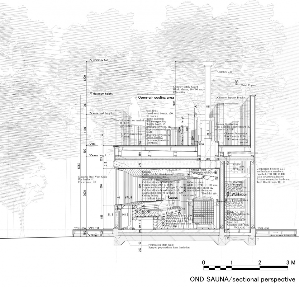 Roof: Hinoki (Japanese cypress) t30 oil stain finish, FRP waterproofing, flexible board t5, CLT panels t150, glass wool 24K, 200 mm