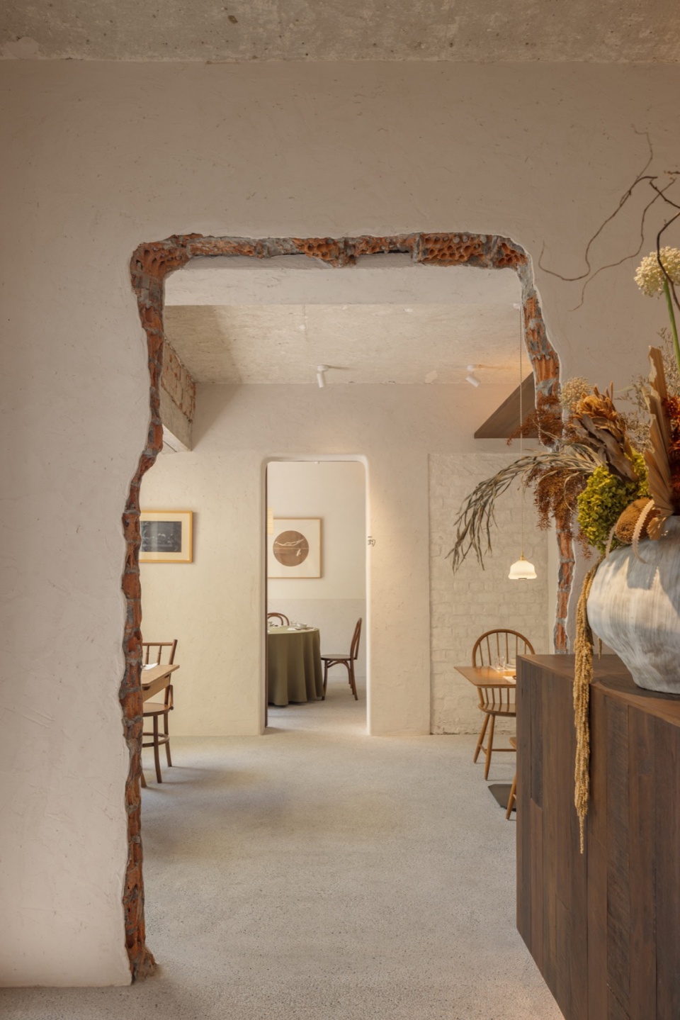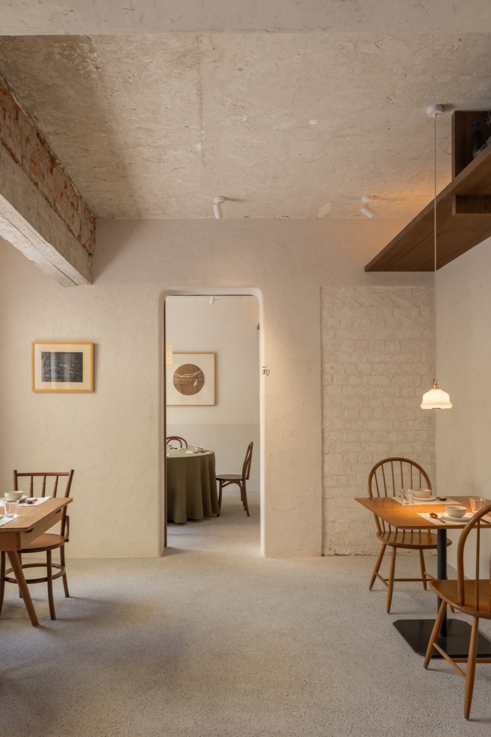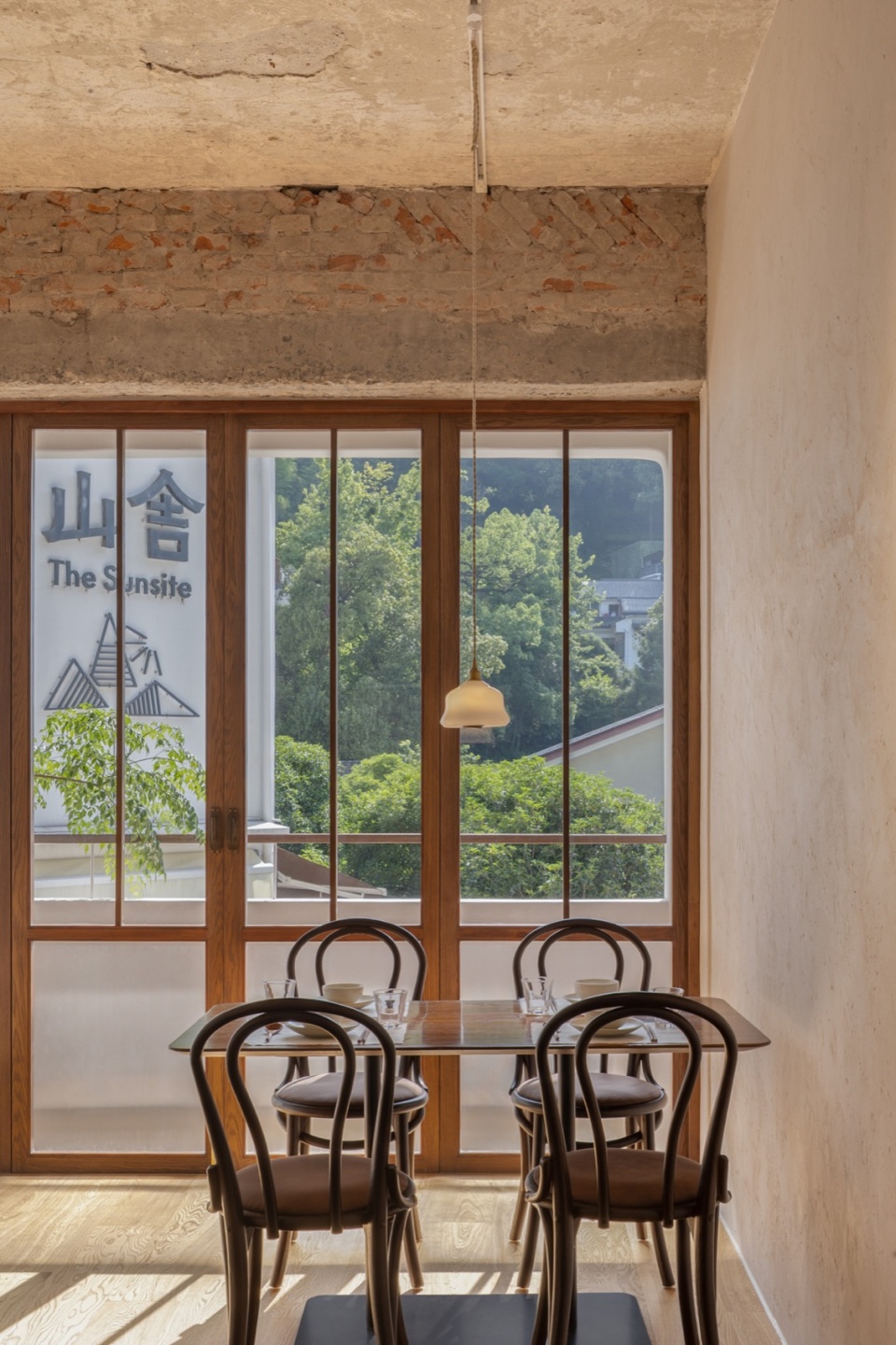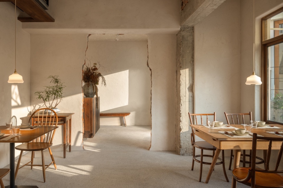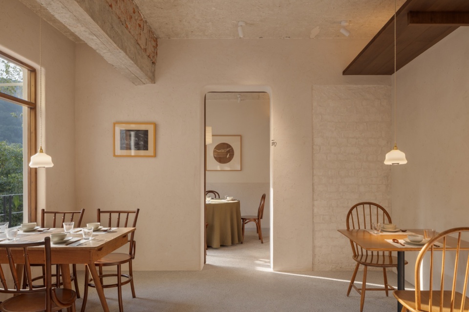 正如所说,“你必须全力以赴,才能看起来毫不费力” ,“桂”餐厅呈现出来的松弛,是一种精心设计的从容。你在这里体验到的放松,无一不出自细节的设计,用心的经营,润物细无声般渗入每一个细胞。粗腻子粉刷的墙面,原始水泥预制板的天花,局部裸露的红砖及现浇水泥柱,工人偶然敲击形成的不规则门洞,原始客房一楼的挂画、老门,裸露的风管机空调,闲鱼淘来的旧玻璃灯罩、黄铜拉手等等,这一切看似“老、旧”,但都是在秉承“美“的前提下、通过精挑细选而形成的品味与调性。