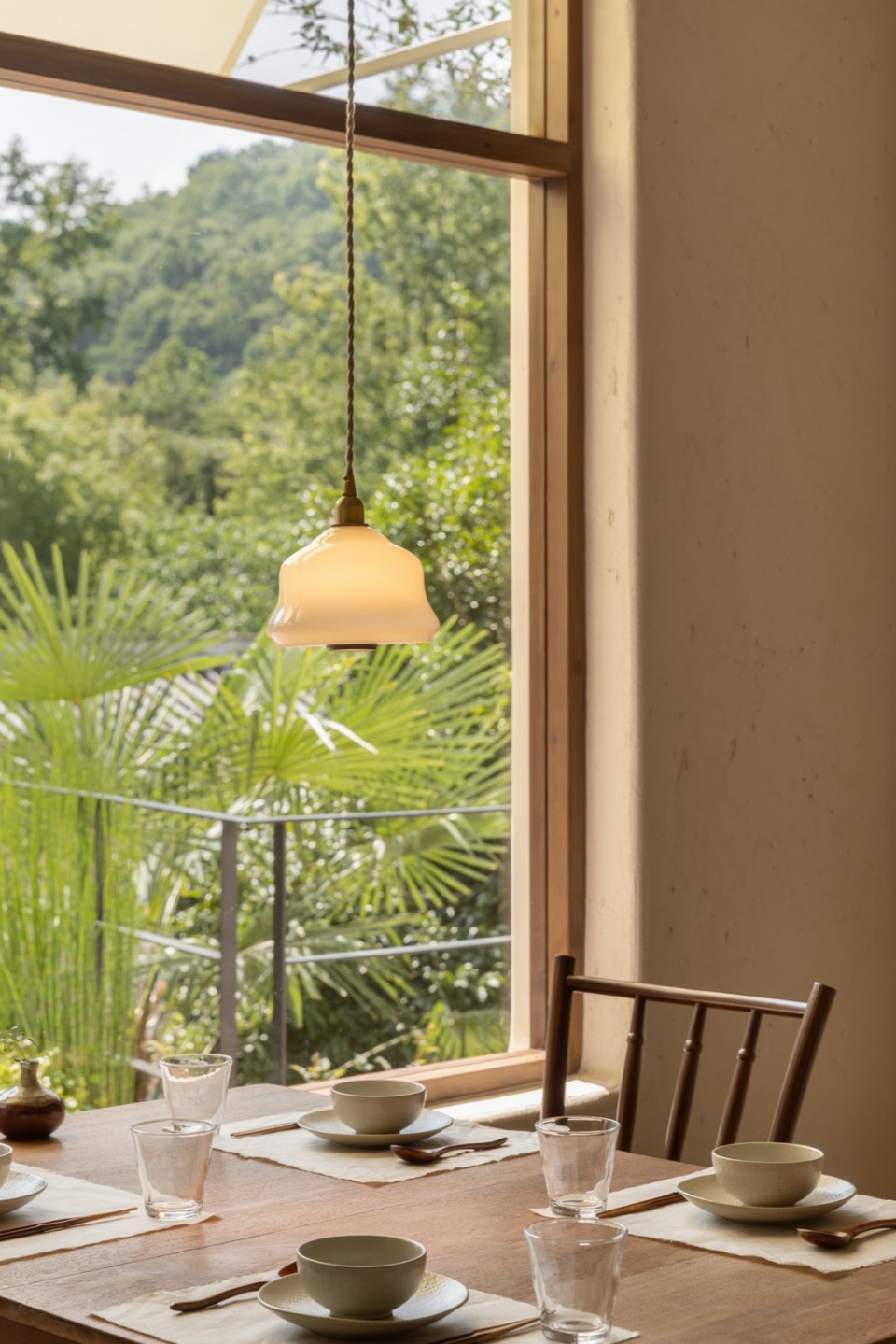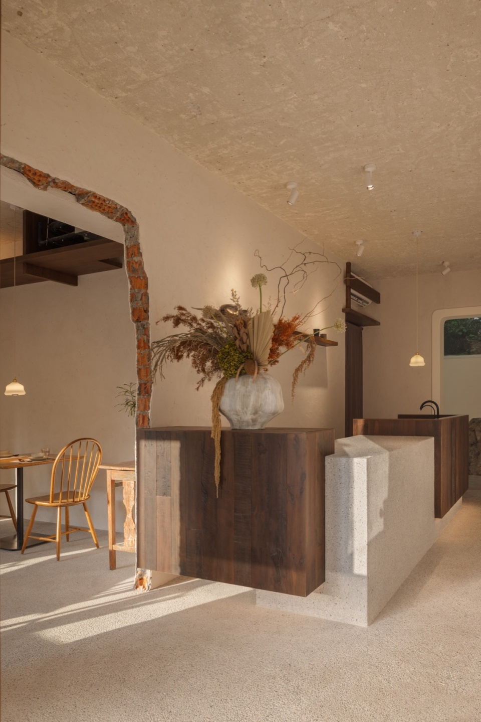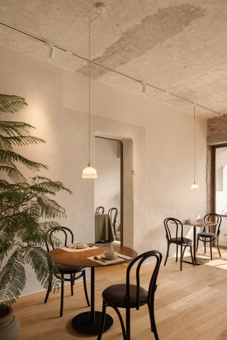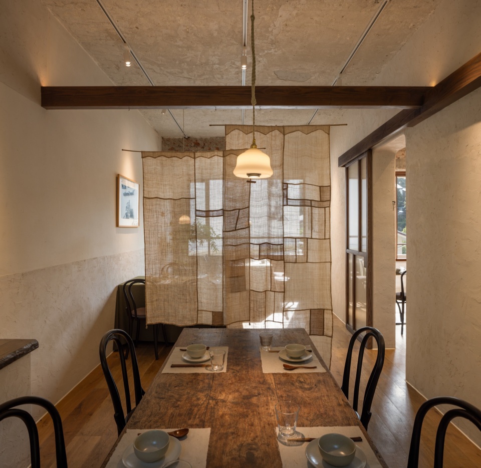正如所说,“你必须全力以赴,才能看起来毫不费力” ,“桂”餐厅呈现出来的松弛,是一种精心设计的从容。你在这里体验到的放松,无一不出自细节的设计,用心的经营,润物细无声般渗入每一个细胞。粗腻子粉刷的墙面,原始水泥预制板的天花,局部裸露的红砖及现浇水泥柱,工人偶然敲击形成的不规则门洞,原始客房一楼的挂画、老门,裸露的风管机空调,闲鱼淘来的旧玻璃灯罩、黄铜拉手等等,这一切看似“老、旧”,但都是在秉承“美“的前提下、通过精挑细选而形成的品味与调性。