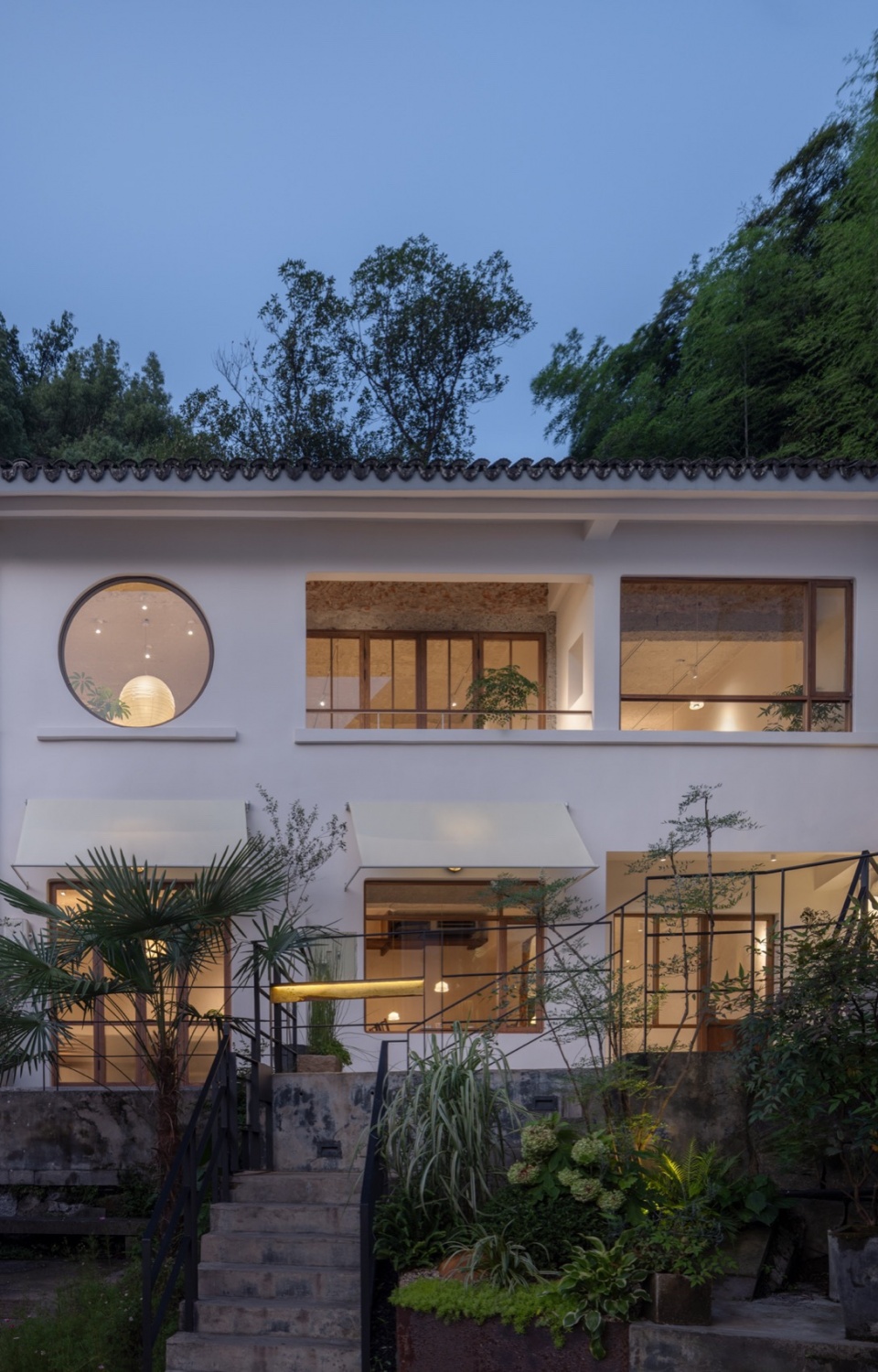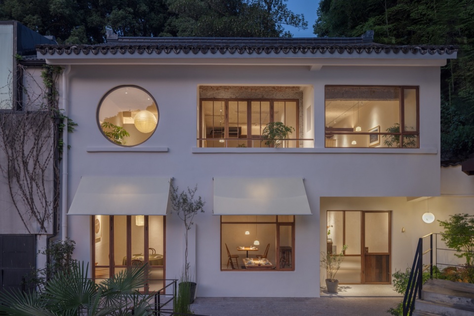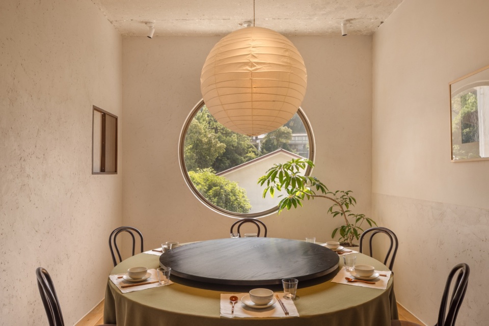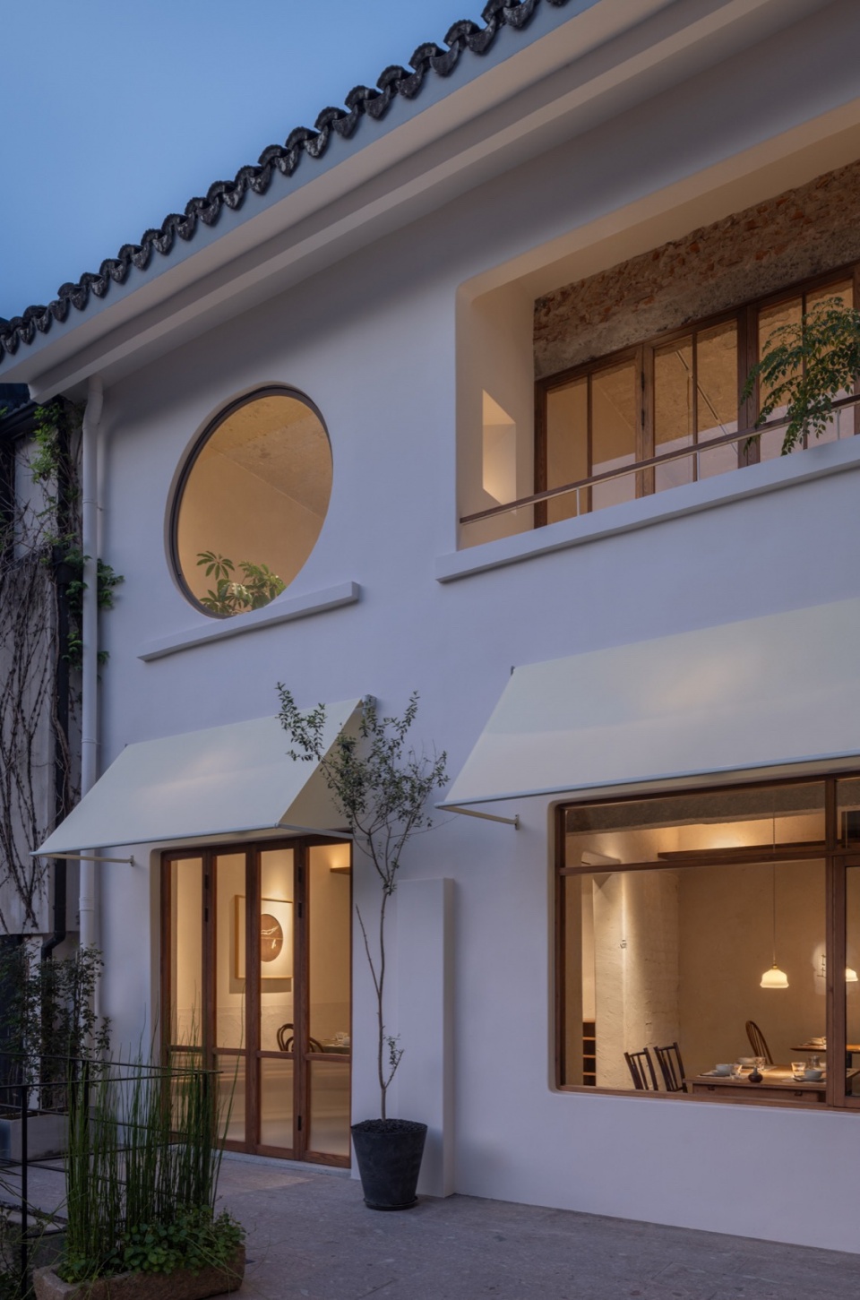 ▼圆窗洞取自中国古典园林的“月洞门”概念,The round window opening is inspired by the “moon gate” concept in classical Chinese gardens