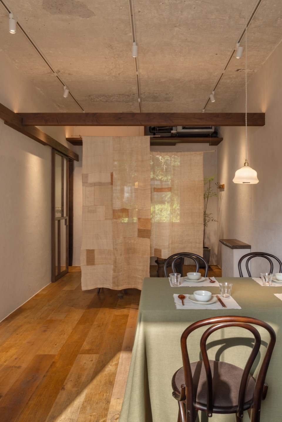 The “GUI” restaurant has two floors. It was formerly a five-room guesthouse. The owner hopes to partially retain the original “time texture” and incorporate new restaurant functions. Upon opening the design plan of the original homestay, we followed the structure of the original building to explore. On the basis of keeping the layout as unchanged as possible, we made several necessary door openings on the partition walls of the original guest rooms to sort out the flow of the dining room and the visual order. At the same time, remove the redundant partition walls that do not bear force to maximize the opening of the space. Subsequently, use soft partition techniques to divide the areas.