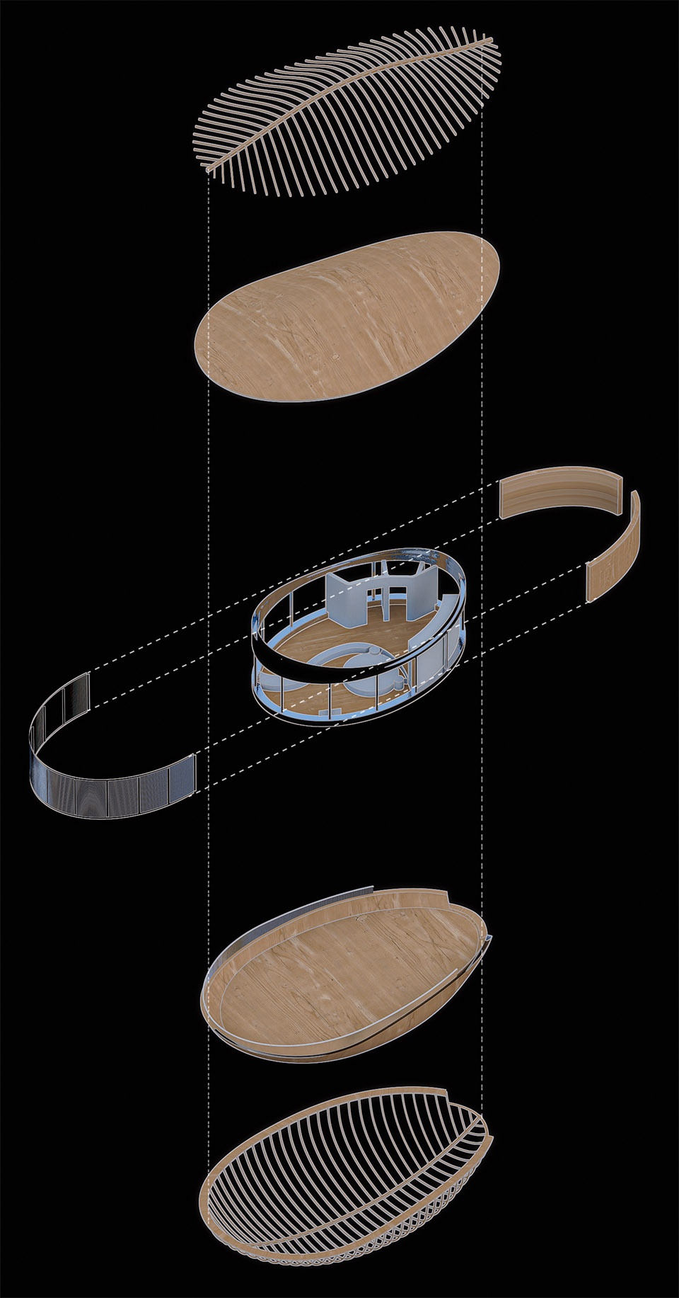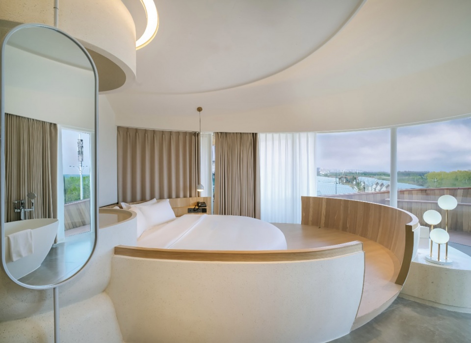 非标准曲线的模块化实现。“林间之巢”的设计语言源于对自然形态的抽象转译。其屋体从鸟巢、蚕茧等生物构筑物中汲取灵感,形成了非标准化的、流动的有机曲线。这种流线型体量打破了传统建筑的几何刚性,使其以垂直群落的姿态,如同自然生长般融入林地与海岸环境,成为城市景观系统本身的一部分。