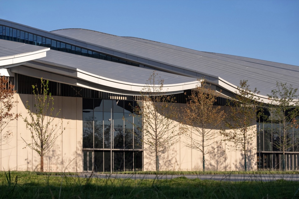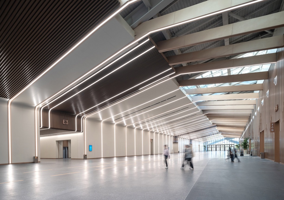 Flanking this north-south axis are the 10,000-square-meter main exhibition hall and the 5,000-square-meter multi-functional exhibition hall, respectively. Both halls feature column-free spaces achieved through long-span truss structures. The overall steel trusses arch along the roof profile, creating clean and powerful lines that are fully exposed to view within the main hall. The varying heights of the roof structure form clerestory windows, which also serve the practical need of providing ample natural daylight for the exhibition halls during daytime use.
