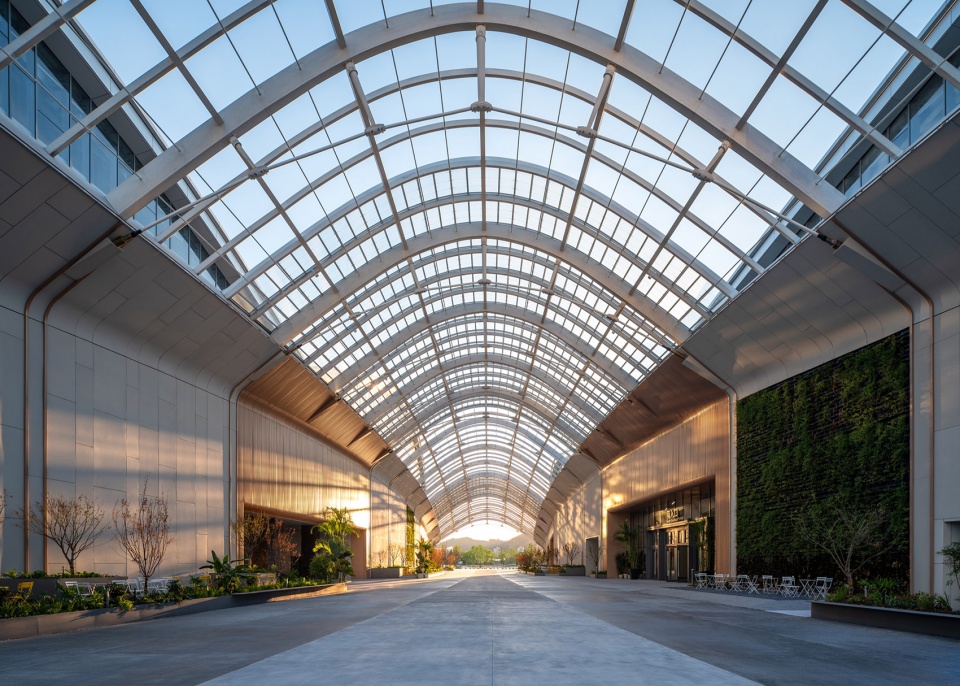 The north-south axis, known as the “Convention Valley,” connects the Cultural and Art Center in the north to the Urban Business District in the south. This expansive indoor north-south space serves as the busiest public area of the convention center and functions as a vibrant, all-weather marketplace during exhibition events.