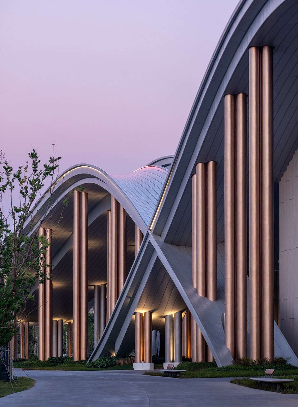 The architectural details utilize materials such as aluminum panels and HUPC to create rich and dynamic plays of light and shadow, evoking the textured curvature of bent bamboo strips.