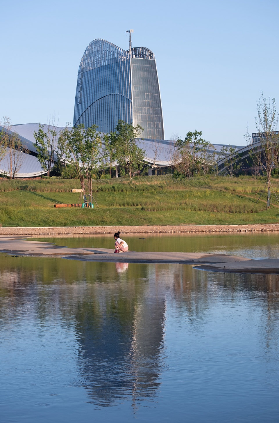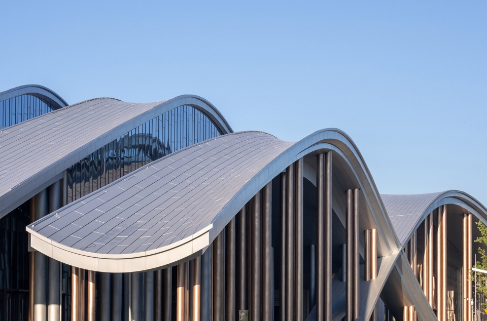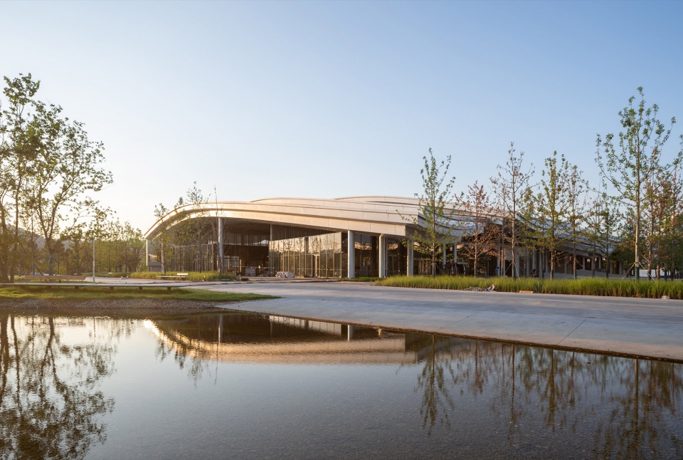整个建筑群如群山一般,时而匍匐在地面,时而拔地而起,时而舒展伸向远方,运用如自然山水的线条,有机延伸,在青山绿水边创造了一个融入环境与城市气质的地标。