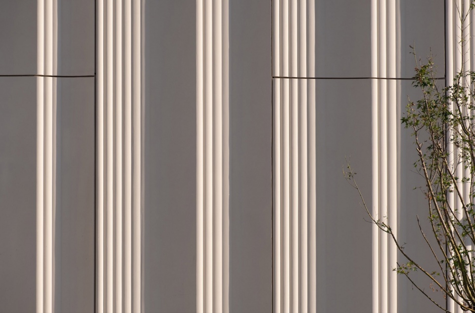 建筑的细部利用铝板与HUPC等材料创造出丰富多变的光影变化,也如同竹片凹曲的肌理造型。
