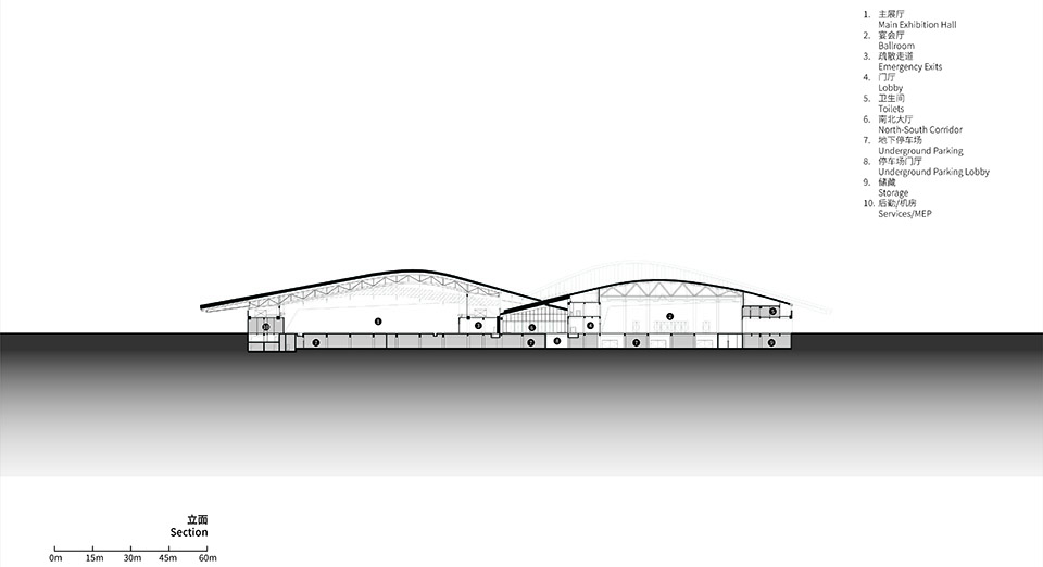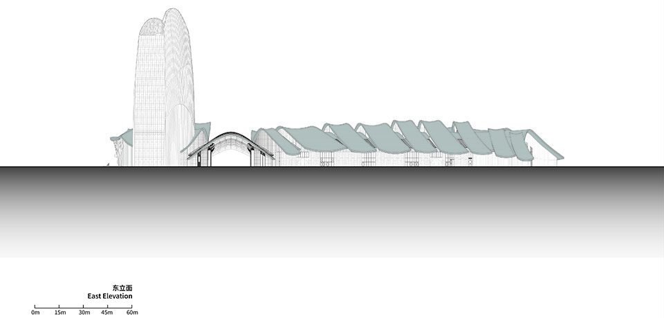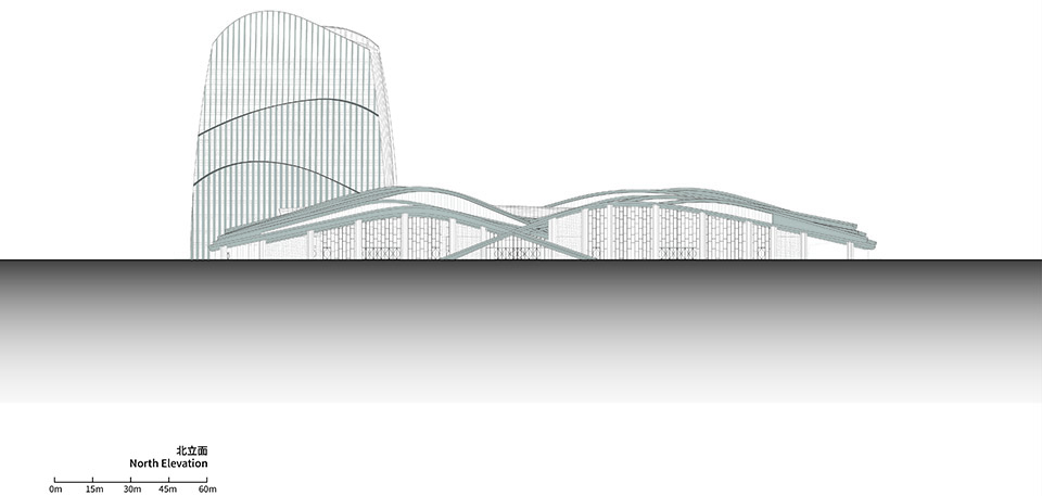 东西向通廊为最重要轴线空间,联系东侧的城市干道灵峰南路,至西侧浒溪河畔的自然滨水景观带。通廊的北侧布局会展、南侧布局酒店功能。这条通廊用轻盈有力的结构形式,保证这条城市景观轴线望山见水的通透视觉效果。