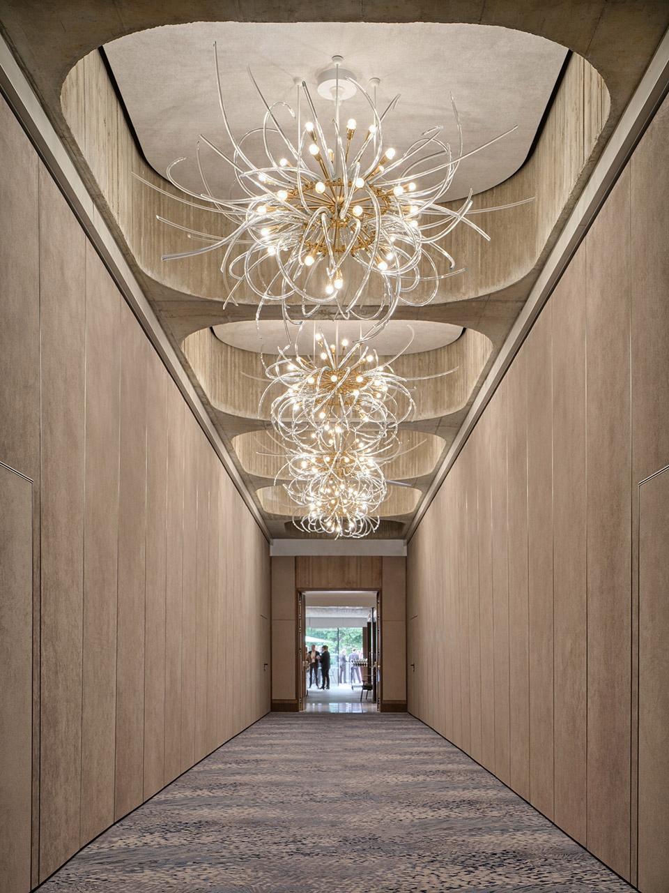 酒店内的吊灯由捷克玻璃品牌Bomma与Preciosa合作设计。大堂中央由马丁·雅内茨基(Martin Janecký)创作的巨型玻璃墙《布拉格的符号》(House Signs of Prague)成为视觉焦点;而康养接待区则由Lasvit、旺达·瓦利赫拉霍娃(Wanda Valihrachová)与TaK建筑师联合创作的一件长8米的流线形雕塑构成,象征流水意象。