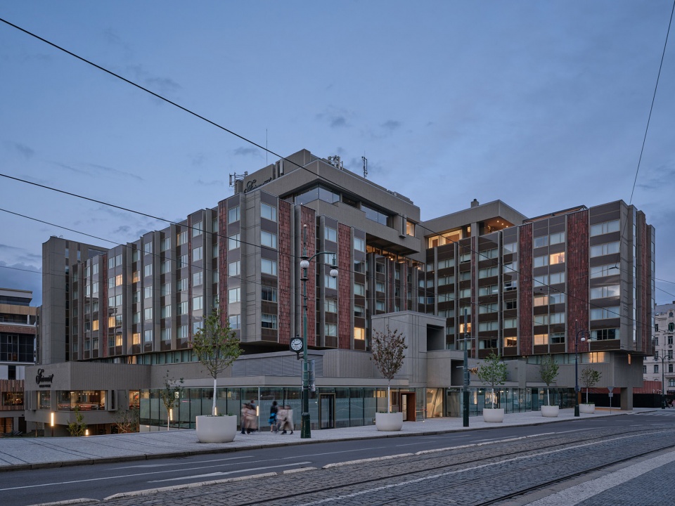 The building’s deteriorating condition posed a significant challenge. Many parts were technically obsolete or structurally unsound, requiring full reconstruction. Despite these issues, the exceptionally broad team, with Metrostav as general contractor, committed to preserving valuable original elements—even when doing so meant a more complex and expensive restoration. Key artworks and architectural features have been carefully restored. The ceramic façade by sculptor Zbyněk Sekal—an icon of the hotel—was recreated, with 48 of the original 52 ceramic strips replaced by newly crafted elements. The hotel’s conference hall ceiling, originally designed by Jan Šrámek and lit by René Roubíček’s chandeliers, was rebuilt to reflect the 1960s dialogue between concrete and glass.