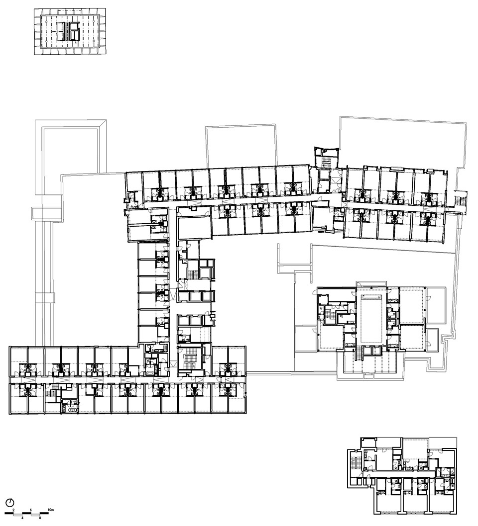 Sustainability played a vital role in the reconstruction. The hotel now uses a geothermal system for heating and cooling, drawing energy from the nearby river. Waste heat from hotel operations—such as kitchens, laundry, and wellness areas—is also reused. In addition, uncompromising water-harvesting strategies have been introduced—covering greywater, rainwater, retention basins, and heat recovery from water systems. Green roofs and vertical gardens enhance thermal comfort and contribute to the local microclimate, while rainwater and greywater systems are used for irrigation. These features highlight the project’s commitment to demonstrating how historic buildings can be renewed with ecological responsibility.
