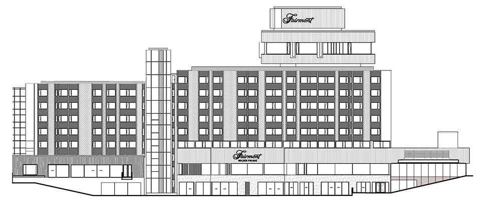 Recognizing the need to revitalize not only the building but also its neglected surroundings, they launched an architectural competition. TaK Architects, led by Marek Tichý, were ultimately selected to lead a comprehensive five-year reconstruction. In parallel, a partnership was formed with Fairmont Hotels & Resorts—an operator aligned with the project’s ambition to bring international standards and a vibrant local presence and to reintroduce the icon as the Fairmont Golden Prague. To support this ambition, the building was expanded through a seamless new layer of facilities, such as an outdoor pool, restaurant wing, or conference extension.