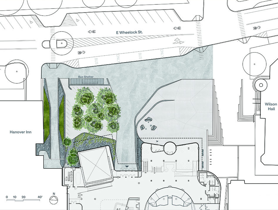 Our design reflects the combination of the rugged and refined that defines this corner of New Hampshire. The exterior plaza is sculpted for intuitive movement to guide visitors towards places for gathering, meeting, and entering. Designed as a platform to elevate the daily lives of students and faculty, the space welcomes visitors and offers a glimpse into the dynamism of the arts processes happening inside the building.